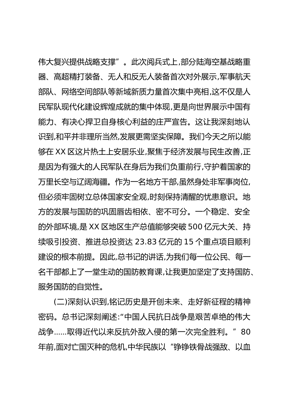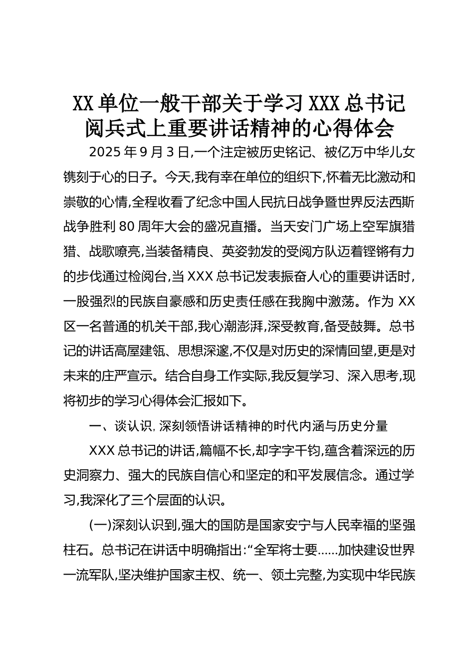 XX單位一般干部關(guān)于學(xué)習(xí)XXX總書(shū)記閱兵式上重要講話精神的心得體會(huì)2025年9月3日,一個(gè)注定被歷史銘記、被億萬(wàn)中華兒女鐫刻于心的日子。今天,我有幸在單位的組織下,懷著無(wú)比激動(dòng)和崇敬的心情,全程收看了紀(jì)念中國(guó)人民抗日戰(zhàn)爭(zhēng)暨世界反法西斯戰(zhàn)爭(zhēng)勝利80周年大會(huì)的盛況直播。當(dāng)天安門(mén)廣場(chǎng)上空軍旗獵獵、戰(zhàn)歌嘹亮,當(dāng)裝備精良、英姿勃發(fā)的受閱方隊(duì)邁著鏗鏘有力的步伐通過(guò)檢閱臺(tái),當(dāng)XXX總書(shū)記發(fā)表振奮人心的重要講話時(shí),一股強(qiáng)烈的民族自豪感和歷史責(zé)任感在我胸中激蕩。作為XX區(qū)一名普通的機(jī)關(guān)干部,我心潮澎湃,深受教育,備受鼓舞??倳?shū)記的講話高屋建瓴、思想深邃,不僅是對(duì)歷史的深...