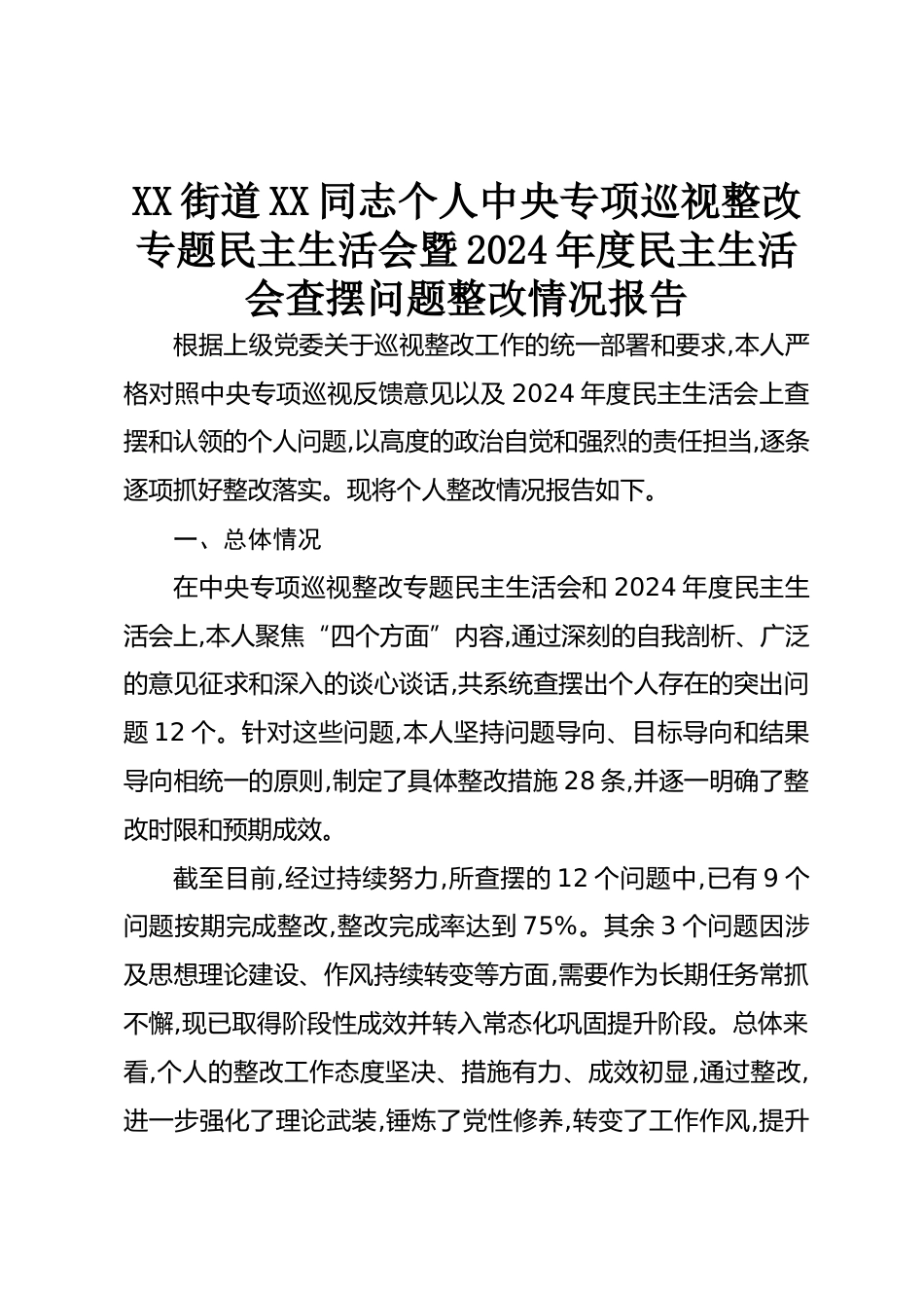 XX街道XX同志個人中央專項巡視整改專題民主生活會暨2024年度民主生活會查擺問題整改情況報告
