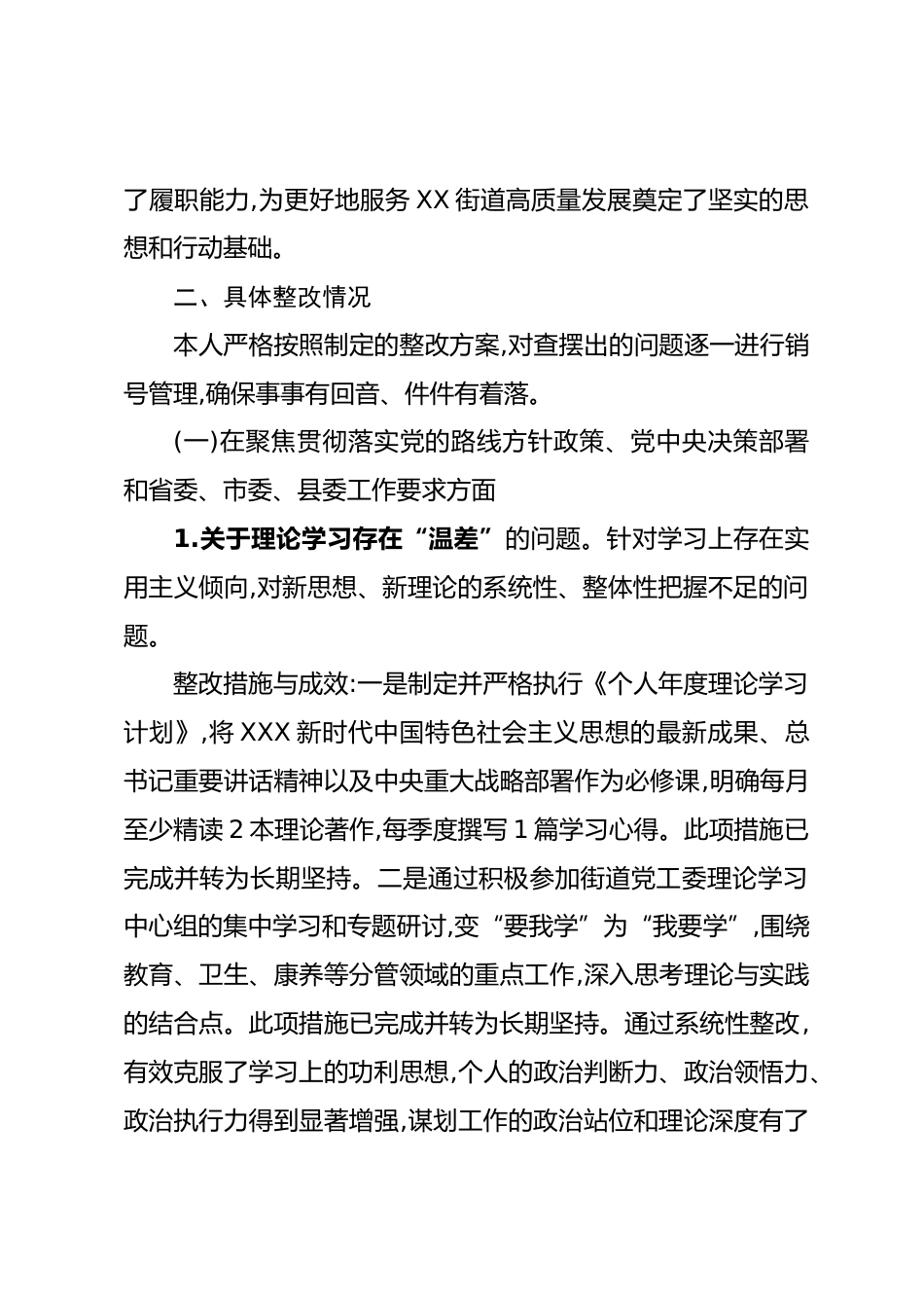 XX街道XX同志個人中央專項巡視整改專題民主生活會暨2024年度民主生活會查擺問題整改情況報告根據(jù)上級黨委關(guān)于巡視整改工作的統(tǒng)一部署和要求,本人嚴(yán)格對照中央專項巡視反饋意見以及2024年度民主生活會上查擺和認(rèn)領(lǐng)的個人問題,以高度的政治自覺和強烈的責(zé)任擔(dān)當(dāng),逐條逐項抓好整改落實?,F(xiàn)將個人整改情況報告如下。一、總體情況在中央專項巡視整改專題民主生活會和2024年度民主生活會上,本人聚焦“四個方面”內(nèi)容,通過深刻的自我剖析、廣泛的意見征求和深入的談心談話,共系統(tǒng)查擺出個人存在的突出問題12個。針對這些問題,本人堅持問題導(dǎo)向、目標(biāo)導(dǎo)向和結(jié)果導(dǎo)向相統(tǒng)一的原則,...