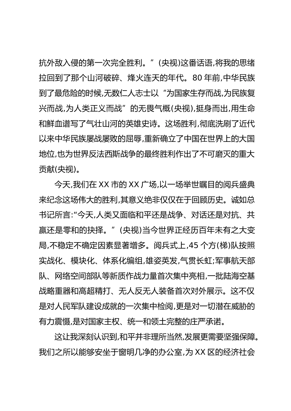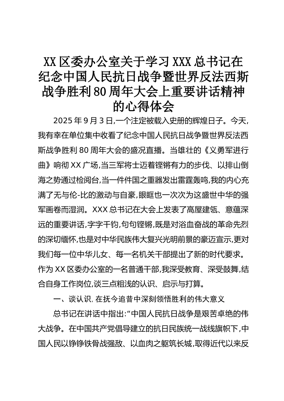 XX區(qū)委辦公室關(guān)于學(xué)習(xí)習(xí)近平總書記在紀(jì)念中國人民抗日戰(zhàn)爭暨世界反法西斯戰(zhàn)爭勝利80周年大會上重要講話精神的心得體會VIP免費