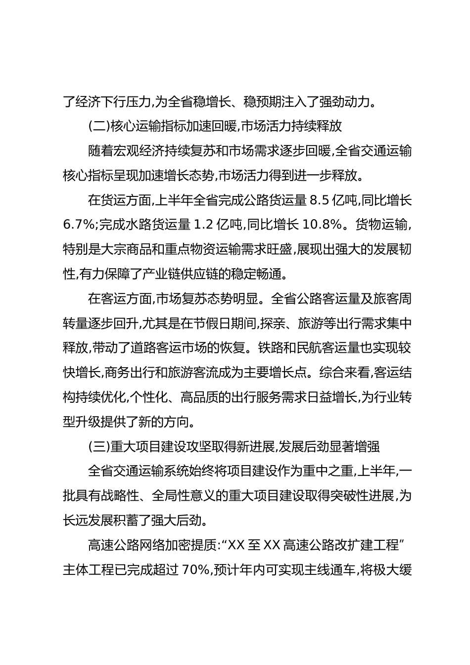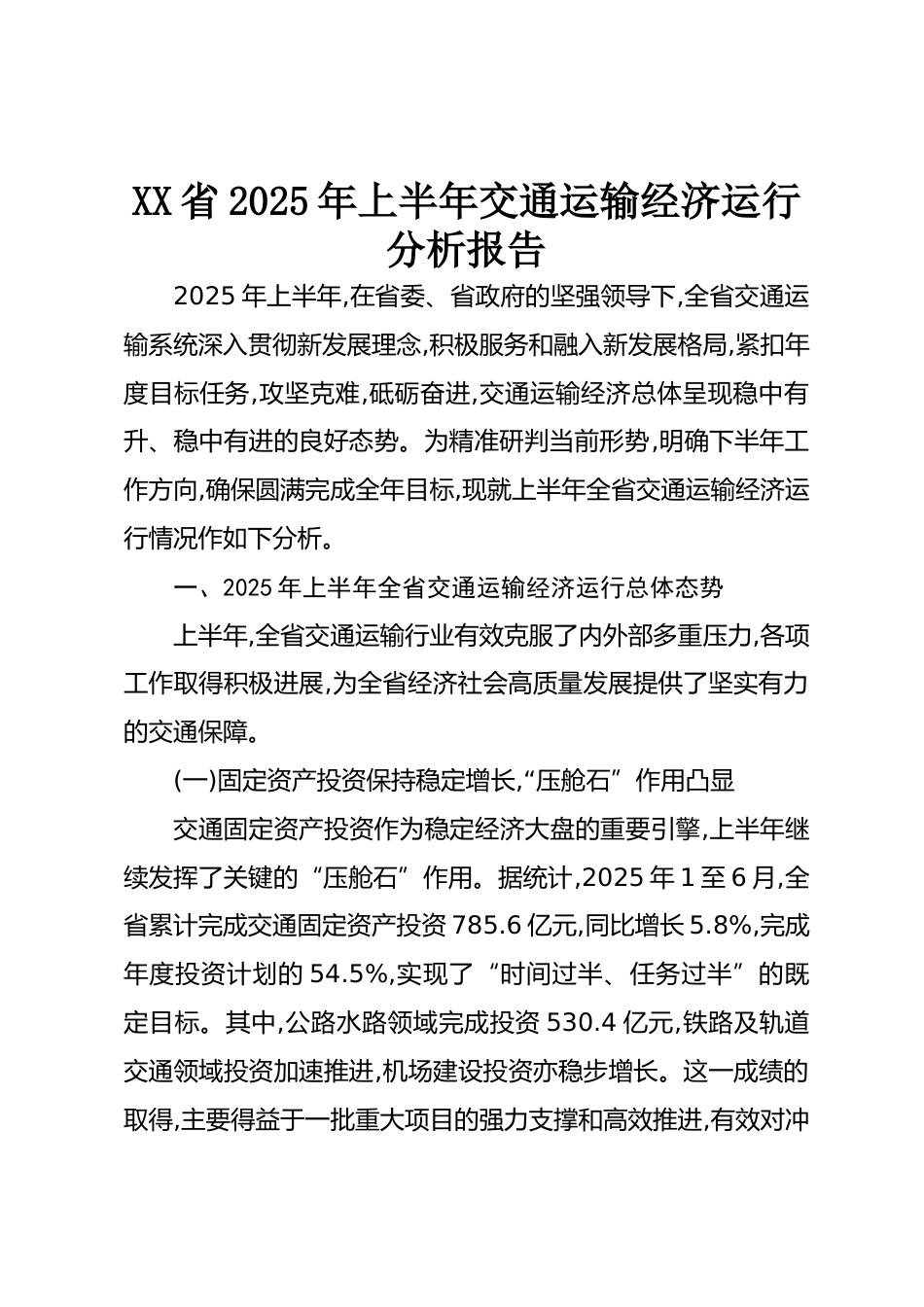 XX省2025年上半年交通運(yùn)輸經(jīng)濟(jì)運(yùn)行分析報告2025年上半年,在省委、省政府的堅強(qiáng)領(lǐng)導(dǎo)下,全省交通運(yùn)輸系統(tǒng)深入貫徹新發(fā)展理念,積極服務(wù)和融入新發(fā)展格局,緊扣年度目標(biāo)任務(wù),攻堅克難,砥礪奮進(jìn),交通運(yùn)輸經(jīng)濟(jì)總體呈現(xiàn)穩(wěn)中有升、穩(wěn)中有進(jìn)的良好態(tài)勢。為精準(zhǔn)研判當(dāng)前形勢,明確下半年工作方向,確保圓滿完成全年目標(biāo),現(xiàn)就上半年全省交通運(yùn)輸經(jīng)濟(jì)運(yùn)行情況作如下分析。一、2025年上半年全省交通運(yùn)輸經(jīng)濟(jì)運(yùn)行總體態(tài)勢上半年,全省交通運(yùn)輸行業(yè)有效克服了內(nèi)外部多重壓力,各項工作取得積極進(jìn)展,為全省經(jīng)濟(jì)社會高質(zhì)量發(fā)展提供了堅實(shí)有力的交通保障。(一)固定資產(chǎn)投資保持穩(wěn)定增長,“壓艙石...