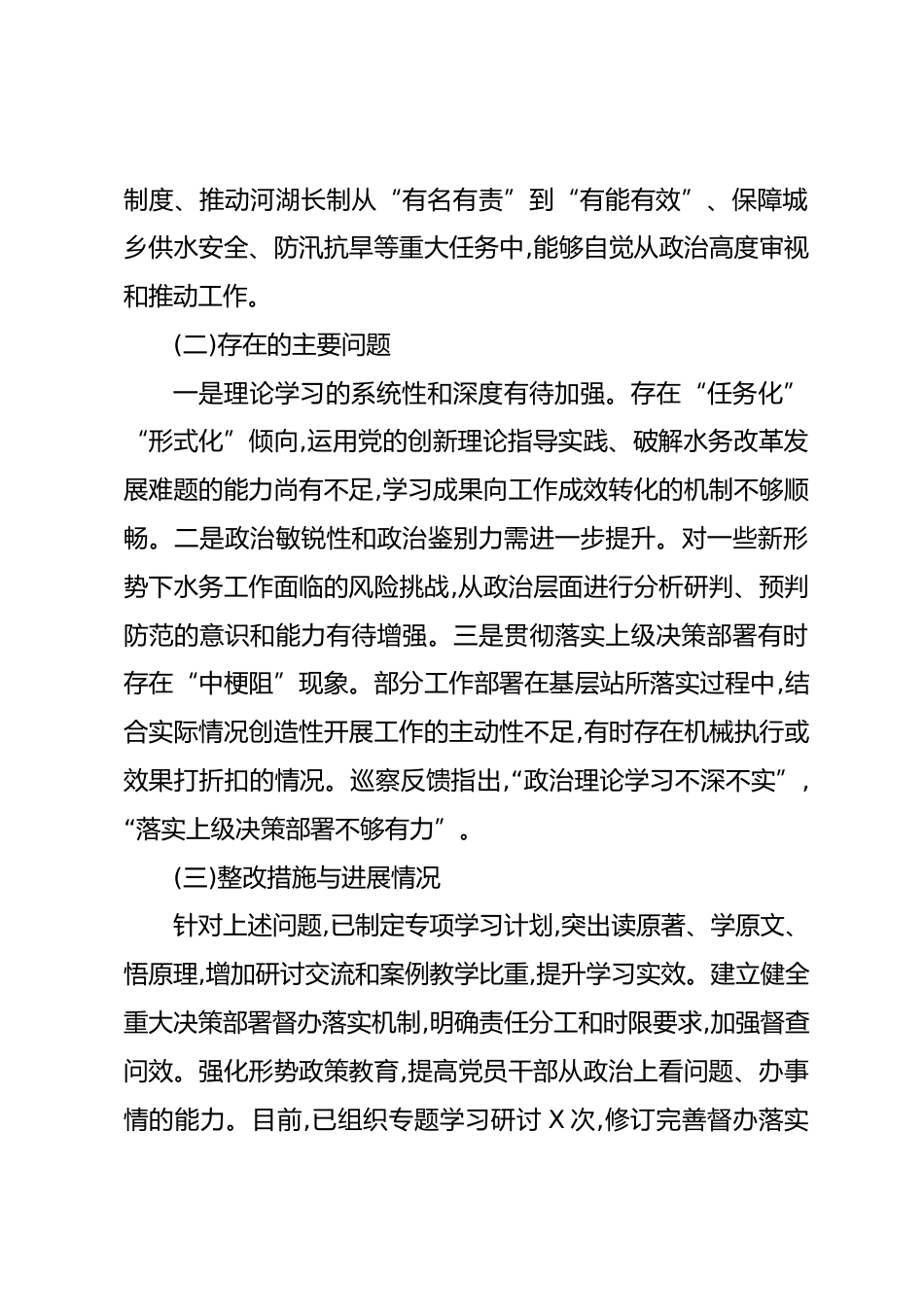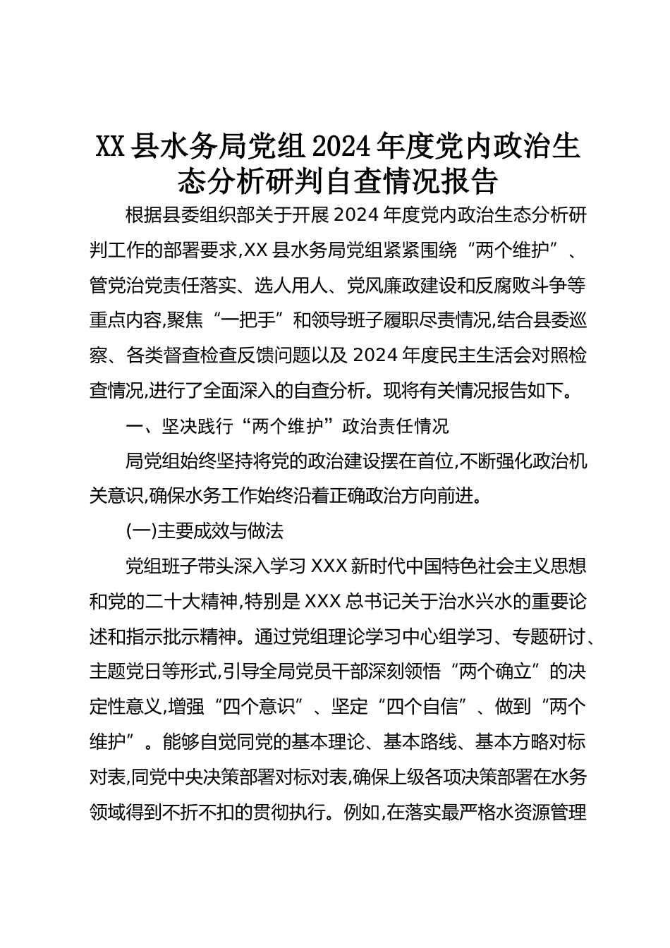 XX縣水務(wù)局黨組2024年度黨內(nèi)政治生態(tài)分析研判自查情況報告根據(jù)縣委組織部關(guān)于開展2024年度黨內(nèi)政治生態(tài)分析研判工作的部署要求,XX縣水務(wù)局黨組緊緊圍繞“兩個維護”、管黨治黨責(zé)任落實、選人用人、黨風(fēng)廉政建設(shè)和反腐敗斗爭等重點內(nèi)容,聚焦“一把手”和領(lǐng)導(dǎo)班子履職盡責(zé)情況,結(jié)合縣委巡察、各類督查檢查反饋問題以及2024年度民主生活會對照檢查情況,進行了全面深入的自查分析?,F(xiàn)將有關(guān)情況報告如下。一、堅決踐行“兩個維護”政治責(zé)任情況局黨組始終堅持將黨的政治建設(shè)擺在首位,不斷強化政治機關(guān)意識,確保水務(wù)工作始終沿著正確政治方向前進。(一)主要成效與做法黨組班子...