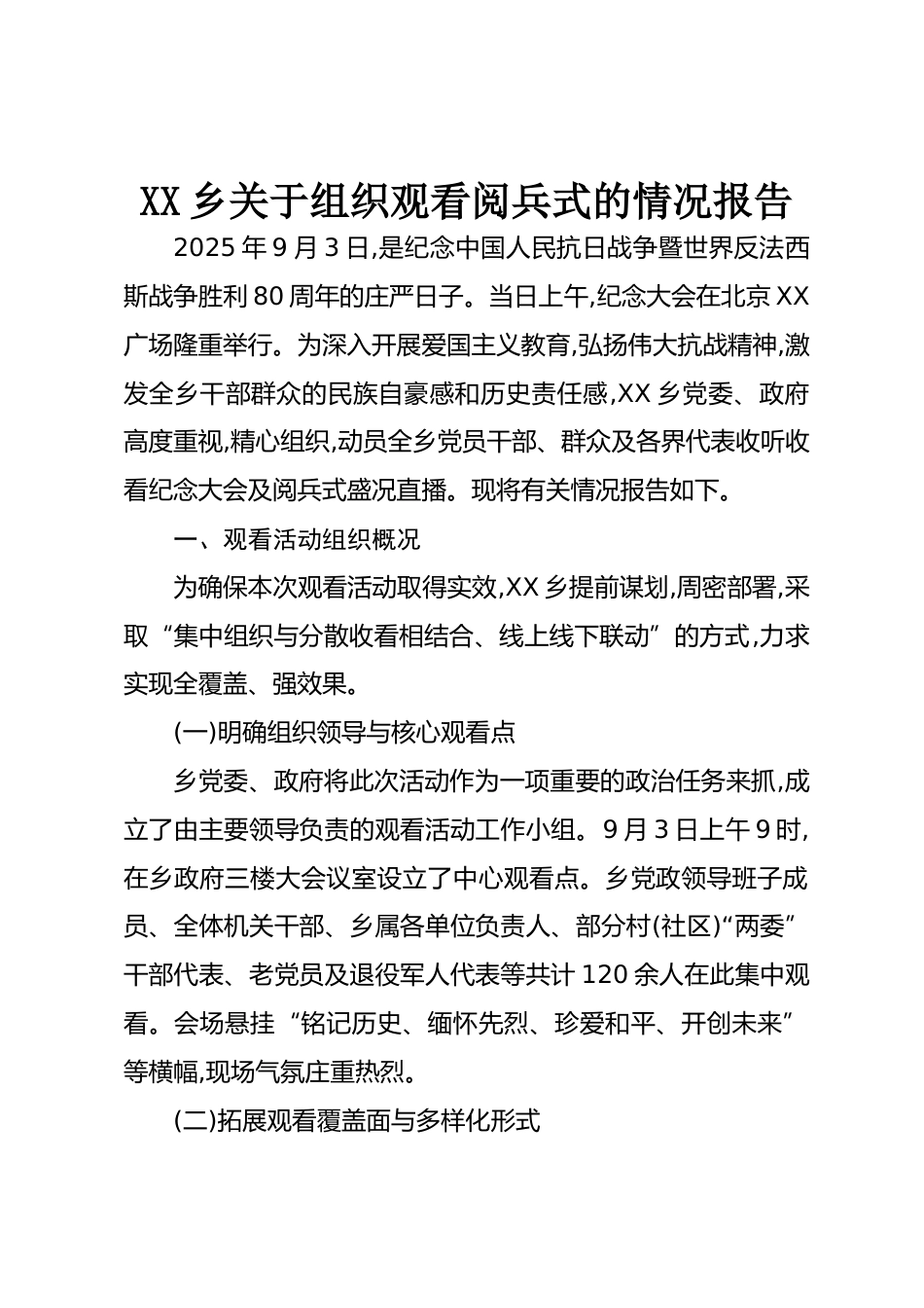 XX鄉(xiāng)關于組織觀看閱兵式的情況報告2025年9月3日,是紀念中國人民抗日戰(zhàn)爭暨世界反法西斯戰(zhàn)爭勝利80周年的莊嚴日子。當日上午,紀念大會在北京XX廣場隆重舉行。為深入開展愛國主義教育,弘揚偉大抗戰(zhàn)精神,激發(fā)全鄉(xiāng)干部群眾的民族自豪感和歷史責任感,XX鄉(xiāng)黨委、政府高度重視,精心組織,動員全鄉(xiāng)黨員干部、群眾及各界代表收聽收看紀念大會及閱兵式盛況直播。現(xiàn)將有關情況報告如下。一、觀看活動組織概況為確保本次觀看活動取得實效,XX鄉(xiāng)提前謀劃,周密部署,采取“集中組織與分散收看相結合、線上線下聯(lián)動”的方式,力求實現(xiàn)全覆蓋、強效果。(一)明確組織領導與核心觀看點鄉(xiāng)黨委、...