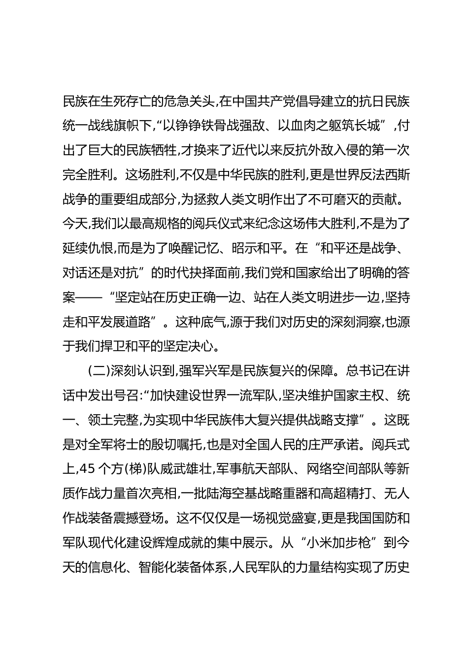 辦公室干部觀看閱兵式心得體會(huì)2025年9月3日,一個(gè)注定被億萬(wàn)中華兒女銘記的日子。天安門廣場(chǎng)上,雄壯的《義勇軍進(jìn)行曲》響徹云霄,三軍將士氣貫長(zhǎng)虹,鐵甲洪流滾滾向前。我作為XX區(qū)一名普通的機(jī)關(guān)干部,在辦公室與同事們懷著無(wú)比激動(dòng)和崇敬的心情,通過(guò)屏幕收看了紀(jì)念中國(guó)人民抗日戰(zhàn)爭(zhēng)暨世界反法西斯戰(zhàn)爭(zhēng)勝利80周年閱兵式的盛況。當(dāng)XXX總書記用鏗鏘有力、擲地有聲的話語(yǔ)發(fā)表重要講話時(shí),我的內(nèi)心受到了強(qiáng)烈的震撼和深刻的洗禮。總書記的講話高屋建瓴、思想深邃,不僅是對(duì)歷史的回望與昭示,更是對(duì)未來(lái)的擘畫與宣言。作為一名身處偉大時(shí)代、肩負(fù)時(shí)代使命的地方工作者,我心潮澎湃,思...