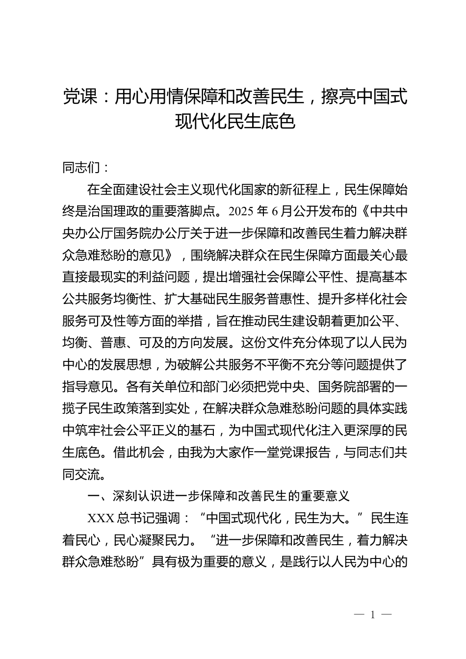 黨課:用心用情保障和改善民生,擦亮中國式現(xiàn)代化民生底色同志們:在全面建設(shè)社會主義現(xiàn)代化國家的新征程上,民生保障始終是治國理政的重要落腳點。2025年6月公開發(fā)布的《中共中央辦公廳國務(wù)院辦公廳關(guān)于進一步保障和改善民生著力解決群眾急難愁盼的意見》,圍繞解決群眾在民生保障方面最關(guān)心最直接最現(xiàn)實的利益問題,提出增強社會保障公平性、提高基本公共服務(wù)均衡性、擴大基礎(chǔ)民生服務(wù)普惠性、提升多樣化社會服務(wù)可及性等方面的舉措,旨在推動民生建設(shè)朝著更加公平、均衡、普惠、可及的方向發(fā)展。這份文件充分體現(xiàn)了以人民為中心的發(fā)展思想,為破解公共服務(wù)不平衡不充...