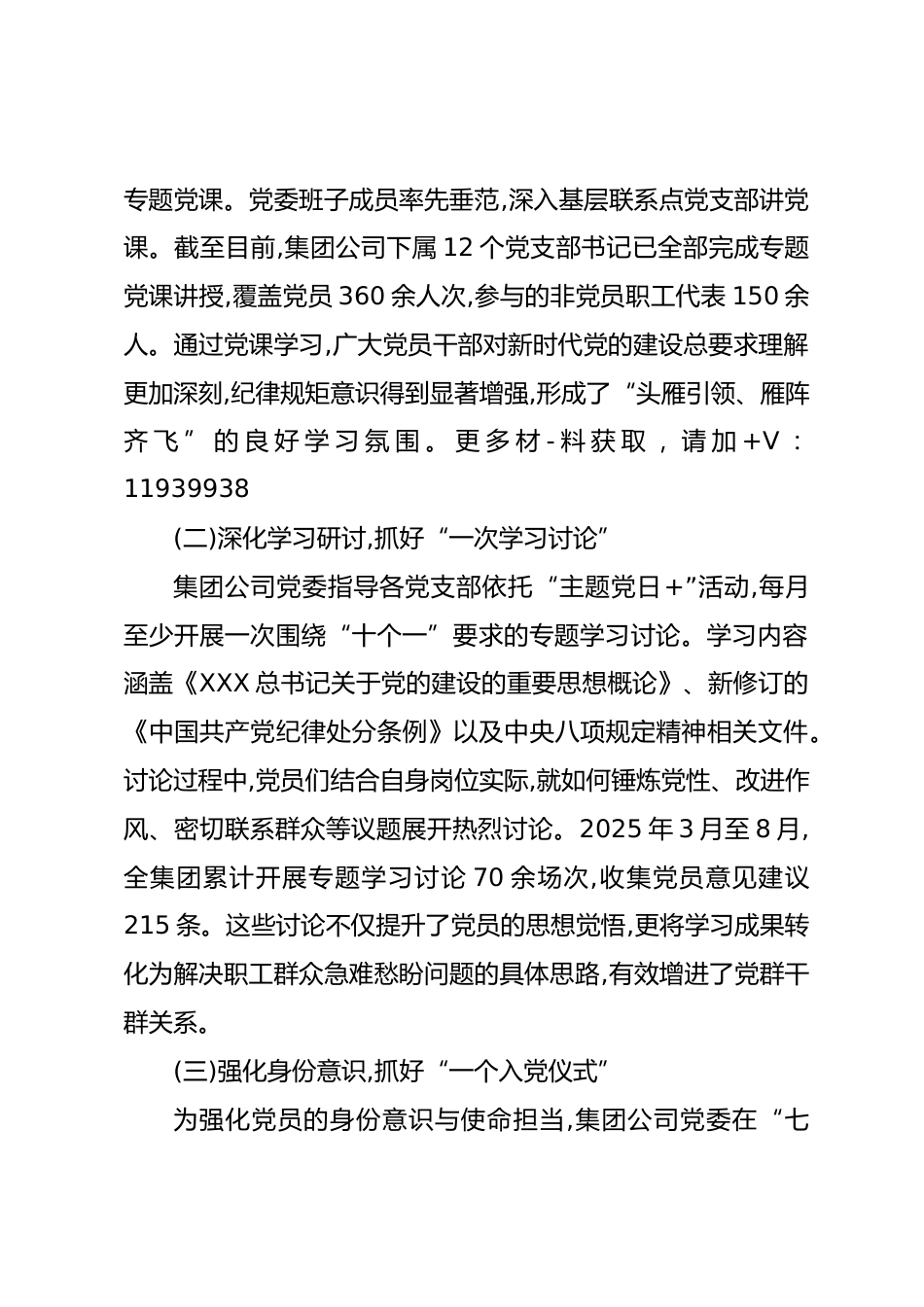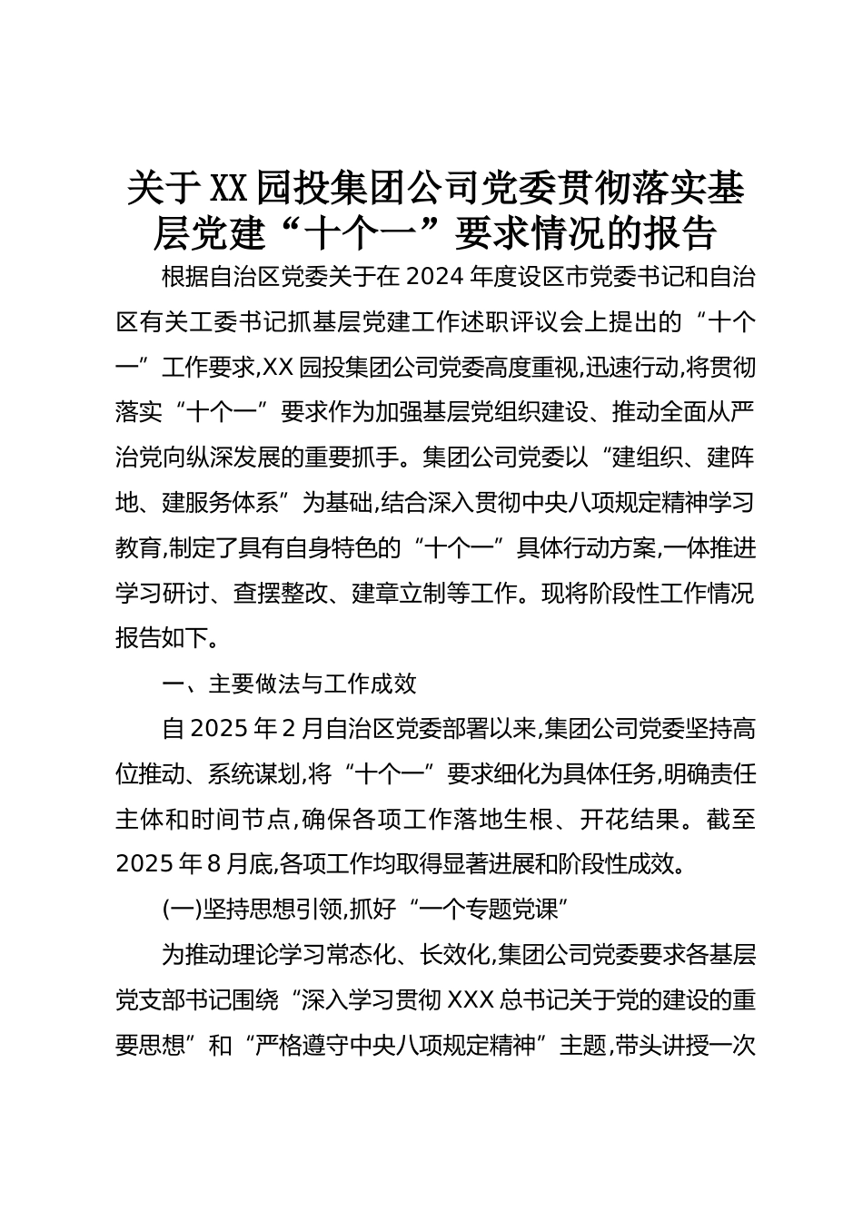 關(guān)于XX園投集團(tuán)公司黨委貫徹落實(shí)基層黨建“十個(gè)一”要求情況的報(bào)告根據(jù)自治區(qū)黨委關(guān)于在2024年度設(shè)區(qū)市黨委書記和自治區(qū)有關(guān)工委書記抓基層黨建工作述職評議會上提出的“十個(gè)一”工作要求,XX園投集團(tuán)公司黨委高度重視,迅速行動,將貫徹落實(shí)“十個(gè)一”要求作為加強(qiáng)基層黨組織建設(shè)、推動全面從嚴(yán)治黨向縱深發(fā)展的重要抓手。集團(tuán)公司黨委以“建組織、建陣地、建服務(wù)體系”為基礎(chǔ),結(jié)合深入貫徹中央八項(xiàng)規(guī)定精神學(xué)習(xí)教育,制定了具有自身特色的“十個(gè)一”具體行動方案,一體推進(jìn)學(xué)習(xí)研討、查擺整改、建章立制等工作。現(xiàn)將階段性工作情況報(bào)告如下。一、主要做法與工作成效自2025年...