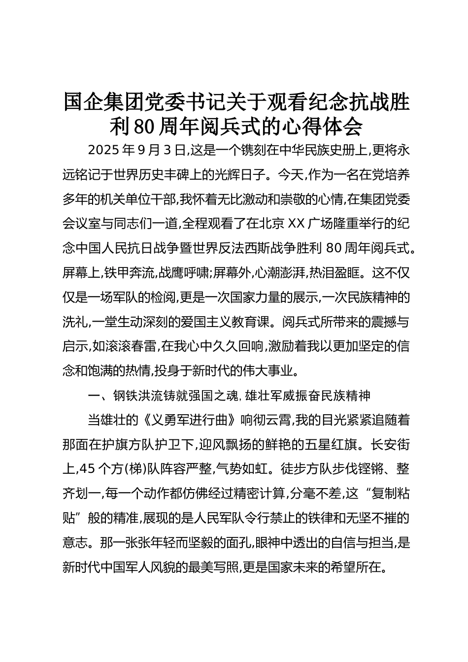 國企集團黨委書記關于觀看紀念抗戰(zhàn)勝利80周年閱兵式的心得體會VIP免費