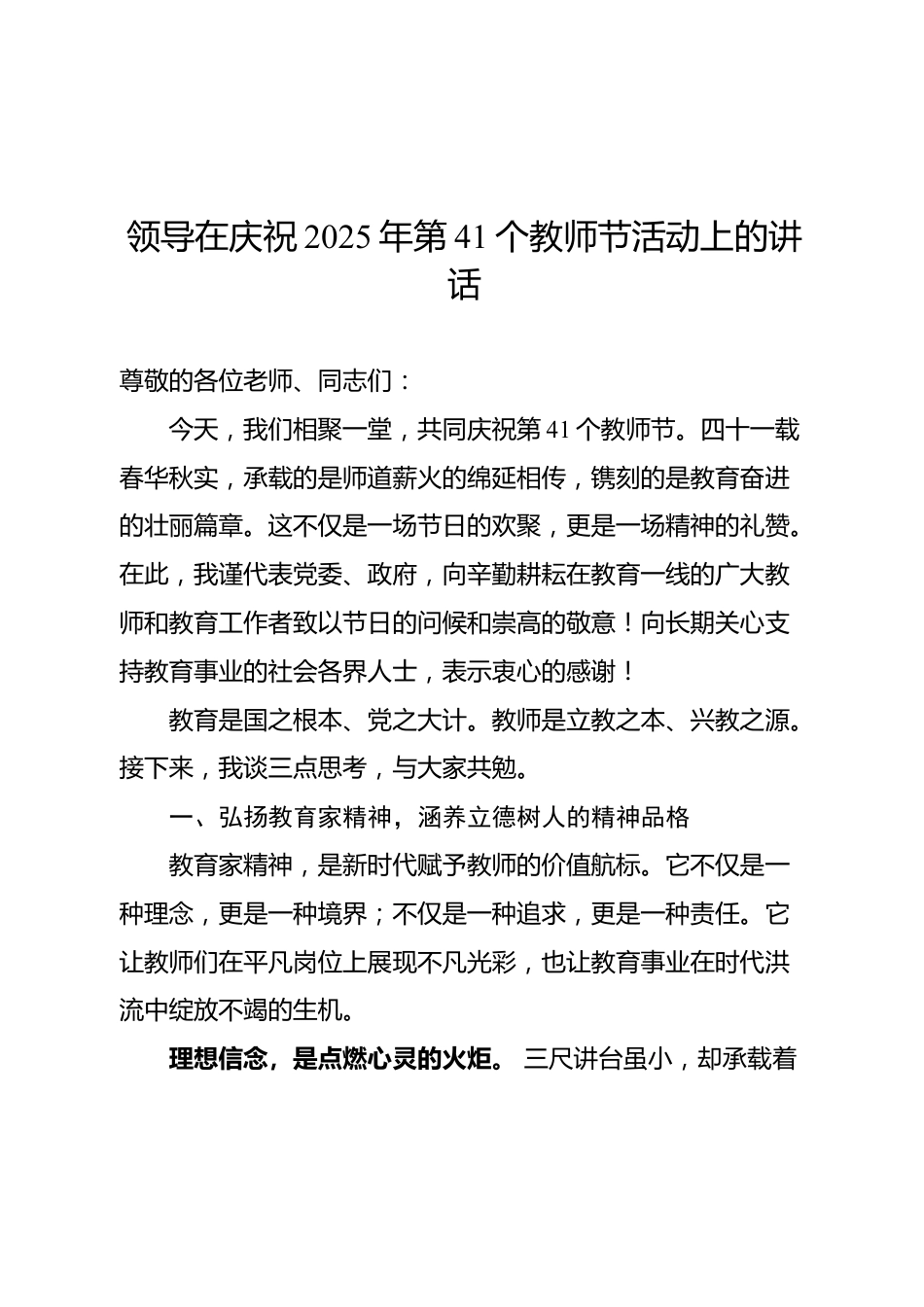 領(lǐng)導在慶祝2025年第41個教師節(jié)活動上的講話尊敬的各位老師、同志們:今天,我們相聚一堂,共同慶祝第41個教師節(jié)。四十一載春華秋實,承載的是師道薪火的綿延相傳,鐫刻的是教育奮進的壯麗篇章。這不僅是一場節(jié)日的歡聚,更是一場精神的禮贊。在此,我謹代表黨委、政府,向辛勤耕耘在教育一線的廣大教師和教育工作者致以節(jié)日的問候和崇高的敬意!向長期關(guān)心支持教育事業(yè)的社會各界人士,表示衷心的感謝!教育是國之根本、黨之大計。教師是立教之本、興教之源。接下來,我談三點思考,與大家共勉。一、弘揚教育家精神,涵養(yǎng)立德樹人的精神品格教育家精神,是新時代賦予教師...
