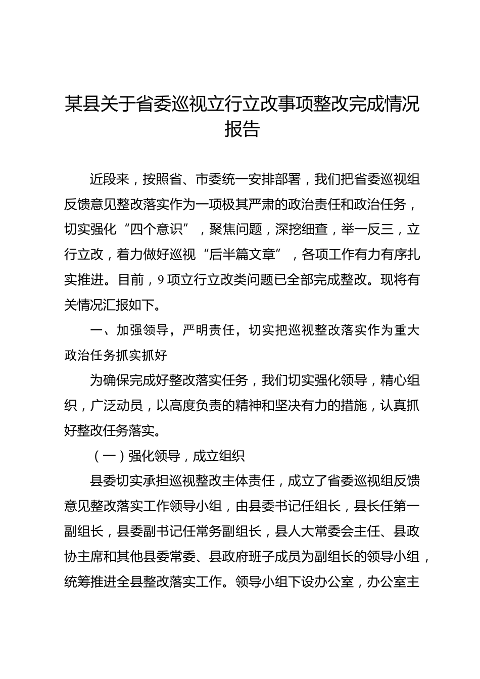 某縣關(guān)于省委巡視立行立改事項(xiàng)整改完成情況報(bào)告
