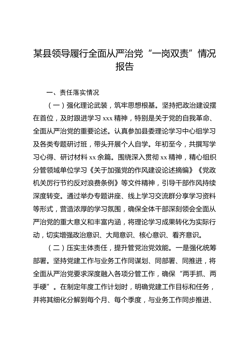 某縣領導履行全面從嚴治黨“一崗雙責”情況報告一、責任落實情況(一)強化理論武裝,筑牢思想根基。堅持把政治建設擺在首位,及時跟進學習xxx精神,特別是關于黨的自我革命、全面從嚴治黨的重要論述。認真參加縣委理論學習中心組學習及各類專題研討班,帶頭開展個人自學。年初至今,共撰寫學習心得、研討材料xx余篇。圍繞深入貫徹xx精神,精心組織分管領域單位學習《關于加強黨的作風建設論述摘編》《黨政機關厲行節(jié)約反對浪費條例》等文件精神,引導干部作風持續(xù)深度轉變。通過舉辦專題講座、線上學習交流群分享學習資料等形式,營造濃厚的學習氛圍,確保全體干部深刻...