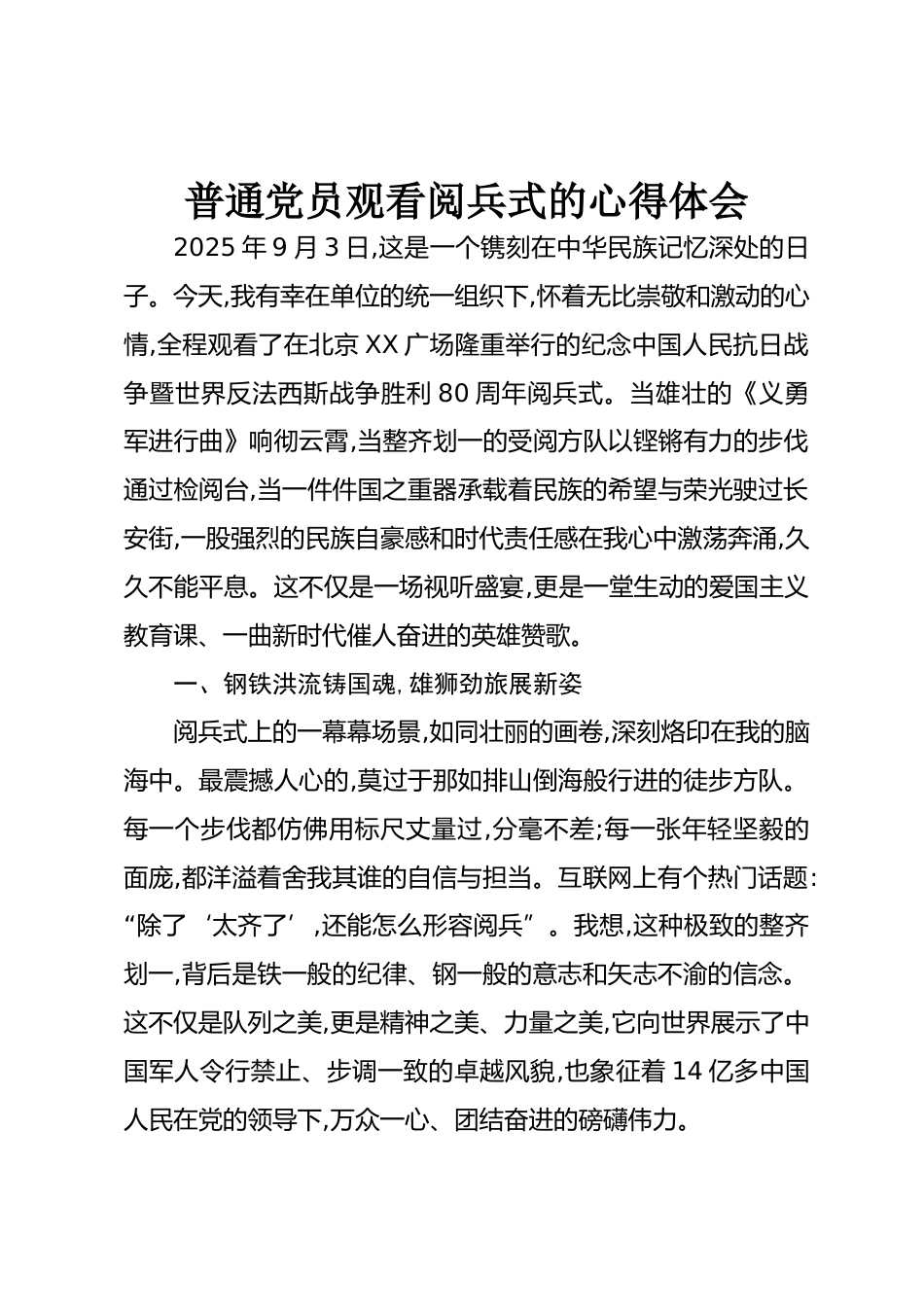 普通黨員觀看閱兵式的心得體會(huì)2025年9月3日,這是一個(gè)鐫刻在中華民族記憶深處的日子。今天,我有幸在單位的統(tǒng)一組織下,懷著無比崇敬和激動(dòng)的心情,全程觀看了在北京XX廣場(chǎng)隆重舉行的紀(jì)念中國(guó)人民抗日戰(zhàn)爭(zhēng)暨世界反法西斯戰(zhàn)爭(zhēng)勝利80周年閱兵式。當(dāng)雄壯的《義勇軍進(jìn)行曲》響徹云霄,當(dāng)整齊劃一的受閱方隊(duì)以鏗鏘有力的步伐通過檢閱臺(tái),當(dāng)一件件國(guó)之重器承載著民族的希望與榮光駛過長(zhǎng)安街,一股強(qiáng)烈的民族自豪感和時(shí)代責(zé)任感在我心中激蕩奔涌,久久不能平息。這不僅是一場(chǎng)視聽盛宴,更是一堂生動(dòng)的愛國(guó)主義教育課、一曲新時(shí)代催人奮進(jìn)的英雄贊歌。一、鋼鐵洪流鑄國(guó)魂,雄獅勁旅展新姿閱...