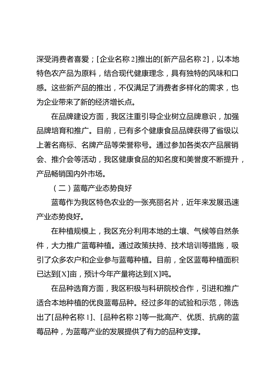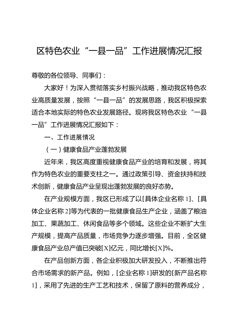 區(qū)特色農(nóng)業(yè)“一縣一品”工作進(jìn)展情況匯報(bào)尊敬的各位領(lǐng)導(dǎo)、同事們:大家好!為深入貫徹落實(shí)鄉(xiāng)村振興戰(zhàn)略,推動(dòng)我區(qū)特色農(nóng)業(yè)高質(zhì)量發(fā)展,按照“一縣一品”的發(fā)展思路,我區(qū)積極探索適合本地實(shí)際的特色農(nóng)業(yè)發(fā)展路徑。現(xiàn)將我區(qū)特色農(nóng)業(yè)“一縣一品”工作進(jìn)展情況匯報(bào)如下:一、工作進(jìn)展情況(一)健康食品產(chǎn)業(yè)蓬勃發(fā)展近年來(lái),我區(qū)高度重視健康食品產(chǎn)業(yè)的培育和發(fā)展,將其作為特色農(nóng)業(yè)的重要支柱之一。通過(guò)政策引導(dǎo)、資金扶持和技術(shù)創(chuàng)新,健康食品產(chǎn)業(yè)呈現(xiàn)出蓬勃發(fā)展的良好態(tài)勢(shì)。在產(chǎn)業(yè)規(guī)模方面,我區(qū)已形成了以[具體企業(yè)名稱1]、[具體企業(yè)名稱2]等為代表的一批健康食品生產(chǎn)企...