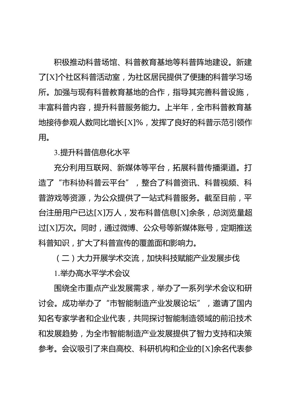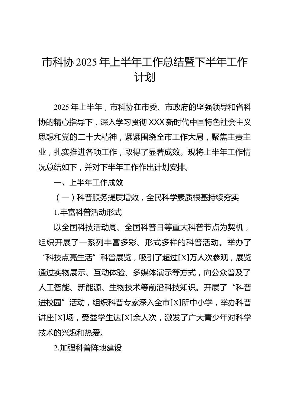 市科協(xié)2025年上半年工作總結(jié)暨下半年工作計劃2025年上半年,市科協(xié)在市委、市政府的堅強領(lǐng)導(dǎo)和省科協(xié)的精心指導(dǎo)下,深入學(xué)習(xí)貫徹XXX新時代中國特色社會主義思想和黨的二十大精神,緊緊圍繞全市工作大局,聚焦主責(zé)主業(yè),扎實推進(jìn)各項工作,取得了顯著成效?,F(xiàn)將上半年工作情況總結(jié)如下,并對下半年工作作出計劃安排。一、上半年工作成效(一)科普服務(wù)提質(zhì)增效,全民科學(xué)素質(zhì)根基持續(xù)夯實1.豐富科普活動形式以全國科技活動周、全國科普日等重大科普節(jié)點為契機,組織開展了一系列豐富多彩、形式多樣的科普活動。舉辦了“科技點亮生活”科普展覽,吸引了超過[X]萬人次參觀,...