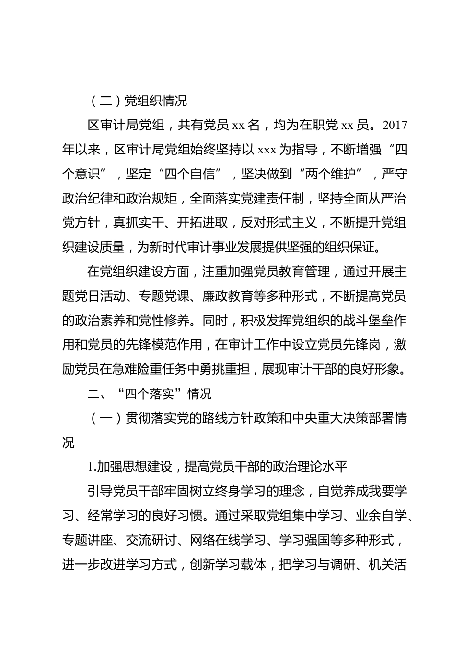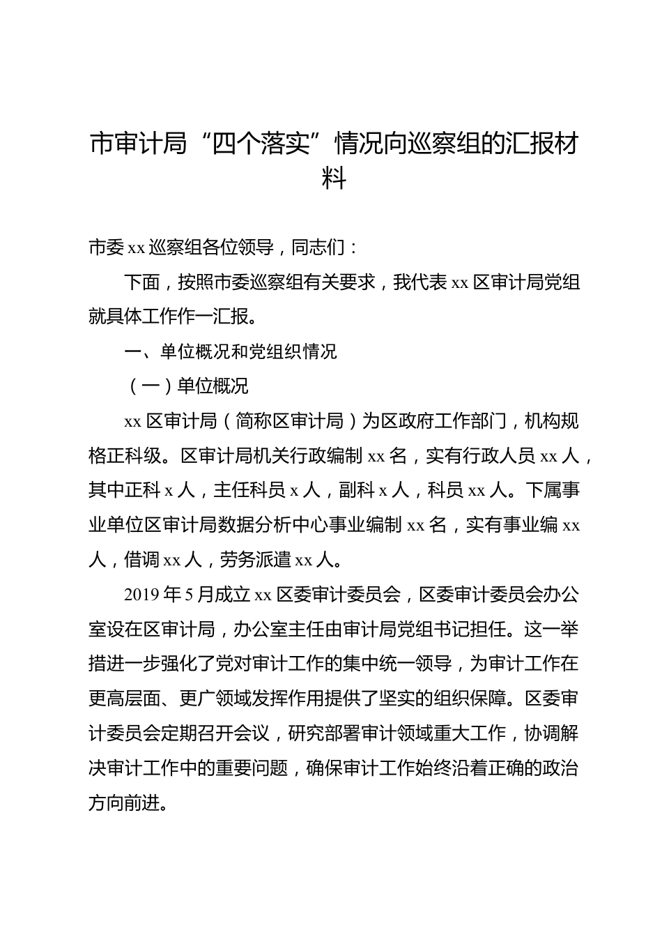 市審計局“四個落實”情況向巡察組的匯報材料市委xx巡察組各位領(lǐng)導(dǎo),同志們:下面,按照市委巡察組有關(guān)要求,我代表xx區(qū)審計局黨組就具體工作作一匯報。一、單位概況和黨組織情況(一)單位概況xx區(qū)審計局(簡稱區(qū)審計局)為區(qū)政府工作部門,機構(gòu)規(guī)格正科級。區(qū)審計局機關(guān)行政編制xx名,實有行政人員xx人,其中正科x人,主任科員x人,副科x人,科員xx人。下屬事業(yè)單位區(qū)審計局?jǐn)?shù)據(jù)分析中心事業(yè)編制xx名,實有事業(yè)編xx人,借調(diào)xx人,勞務(wù)派遣xx人。2019年5月成立xx區(qū)委審計委員會,區(qū)委審計委員會辦公室設(shè)在區(qū)審計局,辦公室主任由審計局黨組書記擔(dān)任。這一舉措進一步強化...