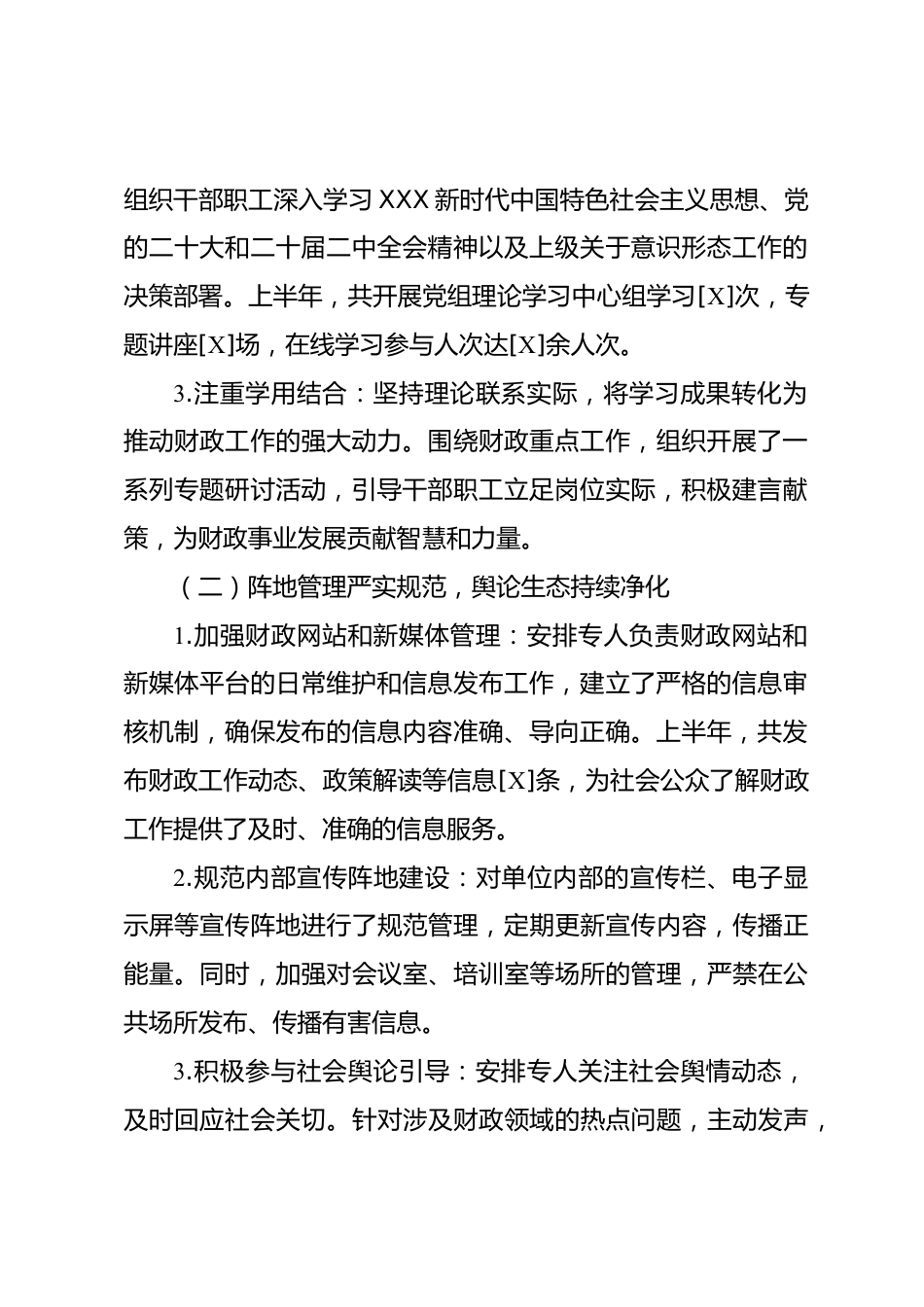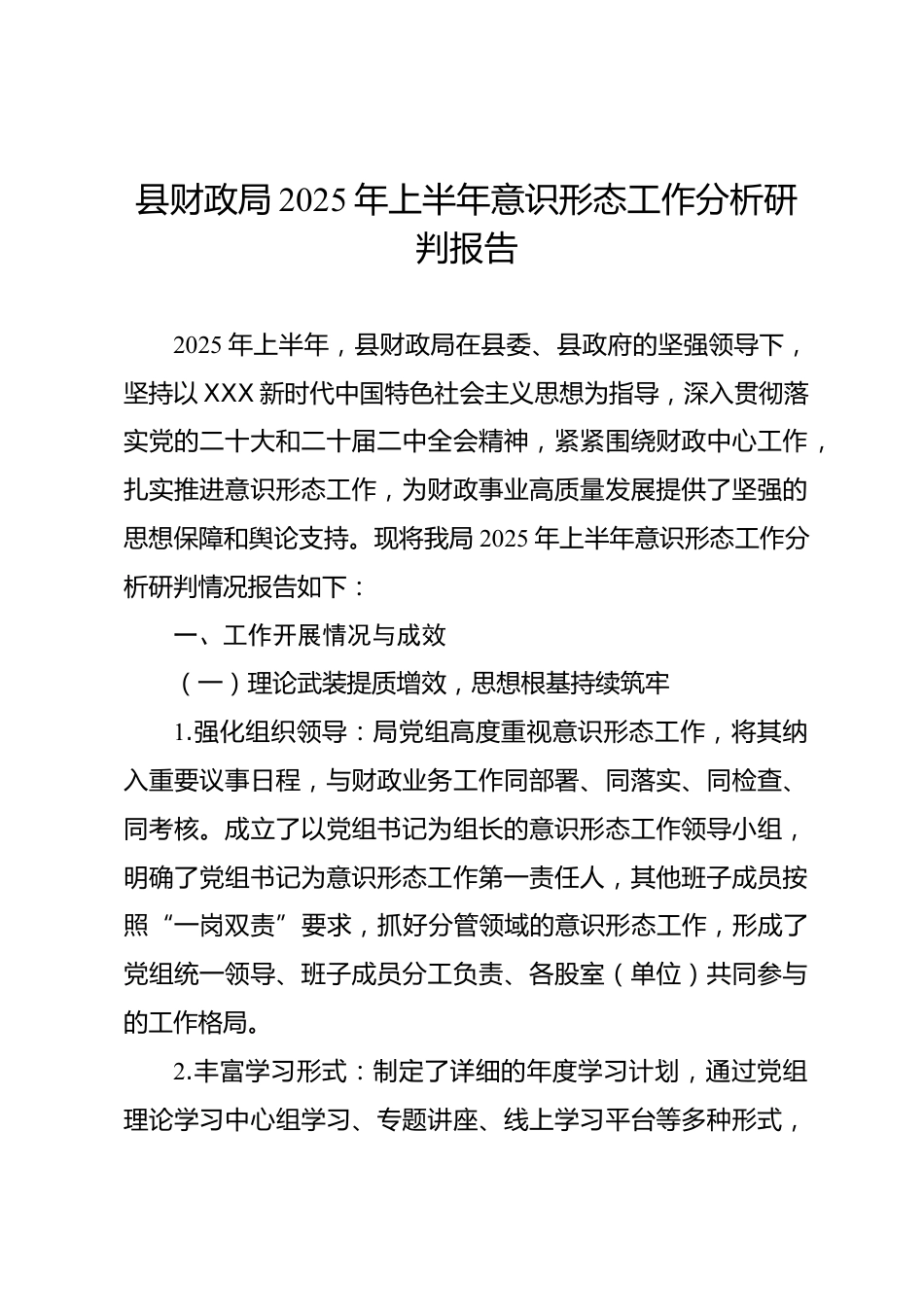 縣財(cái)政局2025年上半年意識(shí)形態(tài)工作分析研判報(bào)告2025年上半年,縣財(cái)政局在縣委、縣政府的堅(jiān)強(qiáng)領(lǐng)導(dǎo)下,堅(jiān)持以XXX新時(shí)代中國(guó)特色社會(huì)主義思想為指導(dǎo),深入貫徹落實(shí)黨的二十大和二十屆二中全會(huì)精神,緊緊圍繞財(cái)政中心工作,扎實(shí)推進(jìn)意識(shí)形態(tài)工作,為財(cái)政事業(yè)高質(zhì)量發(fā)展提供了堅(jiān)強(qiáng)的思想保障和輿論支持?,F(xiàn)將我局2025年上半年意識(shí)形態(tài)工作分析研判情況報(bào)告如下:一、工作開展情況與成效(一)理論武裝提質(zhì)增效,思想根基持續(xù)筑牢1.強(qiáng)化組織領(lǐng)導(dǎo):局黨組高度重視意識(shí)形態(tài)工作,將其納入重要議事日程,與財(cái)政業(yè)務(wù)工作同部署、同落實(shí)、同檢查、同考核。成立了以黨組書記為組長(zhǎng)的...