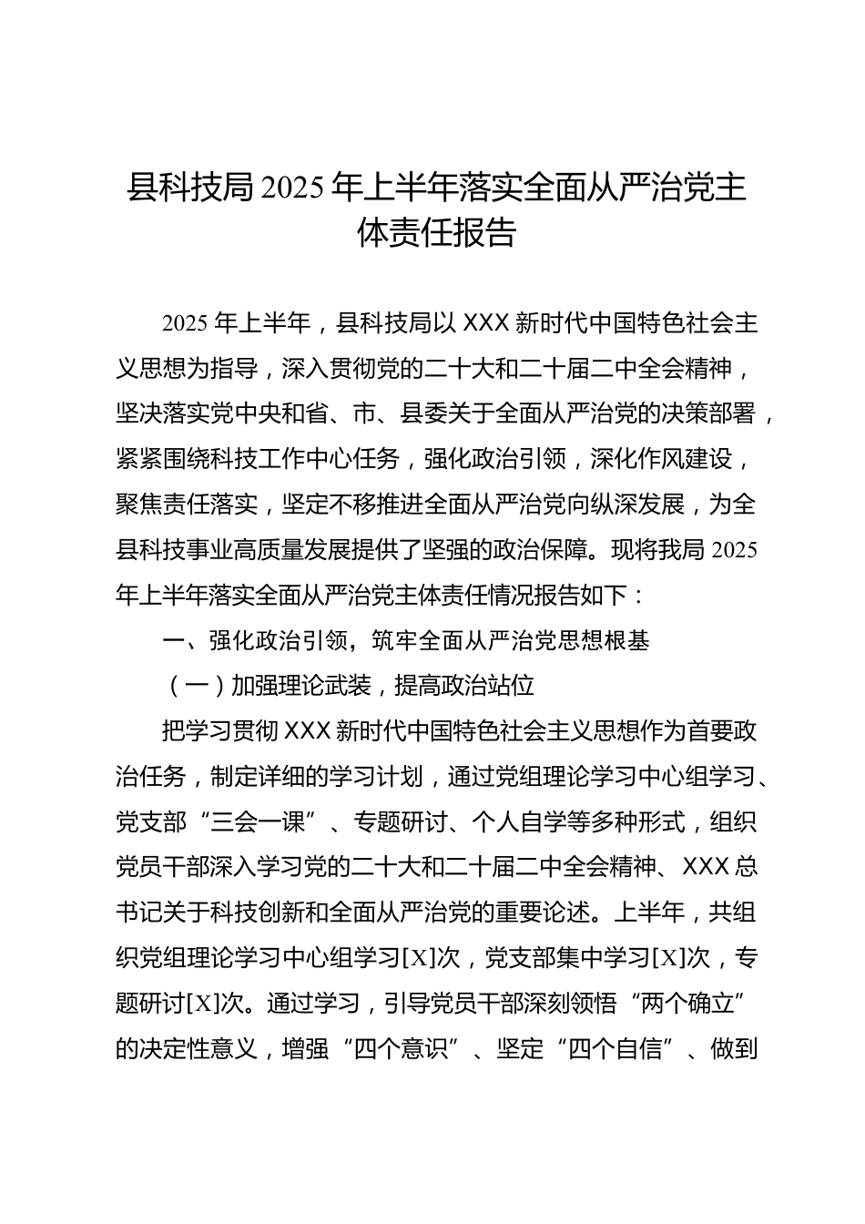 縣科技局2025年上半年落實全面從嚴治黨主體責(zé)任報告2025年上半年,縣科技局以XXX新時代中國特色社會主義思想為指導(dǎo),深入貫徹黨的二十大和二十屆二中全會精神,堅決落實黨中央和省、市、縣委關(guān)于全面從嚴治黨的決策部署,緊緊圍繞科技工作中心任務(wù),強化政治引領(lǐng),深化作風(fēng)建設(shè),聚焦責(zé)任落實,堅定不移推進全面從嚴治黨向縱深發(fā)展,為全縣科技事業(yè)高質(zhì)量發(fā)展提供了堅強的政治保障?,F(xiàn)將我局2025年上半年落實全面從嚴治黨主體責(zé)任情況報告如下:一、強化政治引領(lǐng),筑牢全面從嚴治黨思想根基(一)加強理論武裝,提高政治站位把學(xué)習(xí)貫徹XXX新時代中國特色社會主義思想作為...