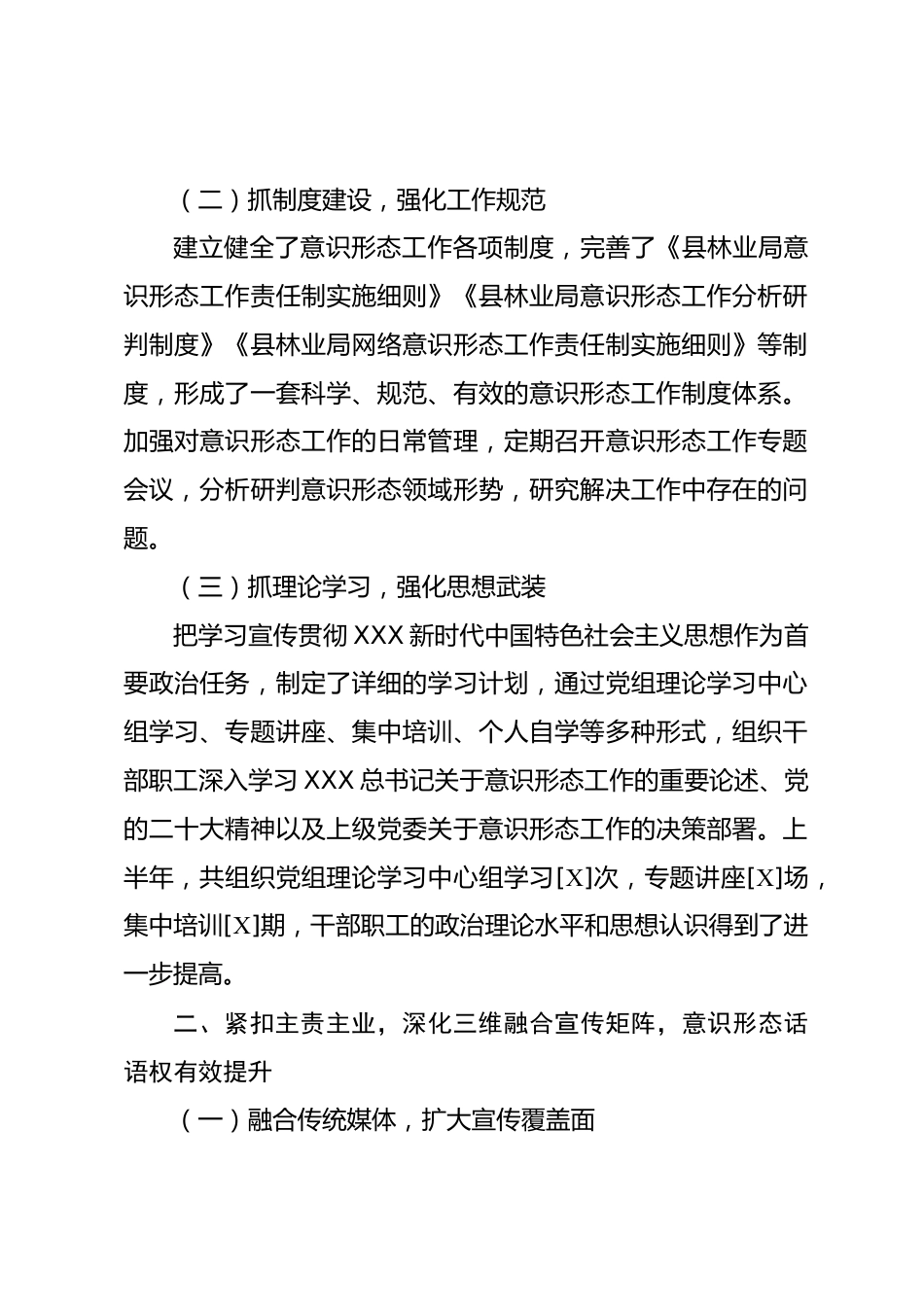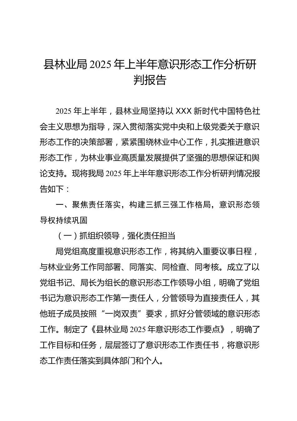 縣林業(yè)局2025年上半年意識(shí)形態(tài)工作分析研判報(bào)告2025年上半年,縣林業(yè)局堅(jiān)持以XXX新時(shí)代中國(guó)特色社會(huì)主義思想為指導(dǎo),深入貫徹落實(shí)黨中央和上級(jí)黨委關(guān)于意識(shí)形態(tài)工作的決策部署,緊緊圍繞林業(yè)中心工作,扎實(shí)推進(jìn)意識(shí)形態(tài)工作,為林業(yè)事業(yè)高質(zhì)量發(fā)展提供了堅(jiān)強(qiáng)的思想保證和輿論支持?,F(xiàn)將我局2025年上半年意識(shí)形態(tài)工作分析研判情況報(bào)告如下:一、聚焦責(zé)任落實(shí),構(gòu)建三抓三強(qiáng)工作格局,意識(shí)形態(tài)領(lǐng)導(dǎo)權(quán)持續(xù)鞏固(一)抓組織領(lǐng)導(dǎo),強(qiáng)化責(zé)任擔(dān)當(dāng)局黨組高度重視意識(shí)形態(tài)工作,將其納入重要議事日程,與林業(yè)業(yè)務(wù)工作同部署、同落實(shí)、同檢查、同考核。成立了以黨組書(shū)記、局長(zhǎng)為組...