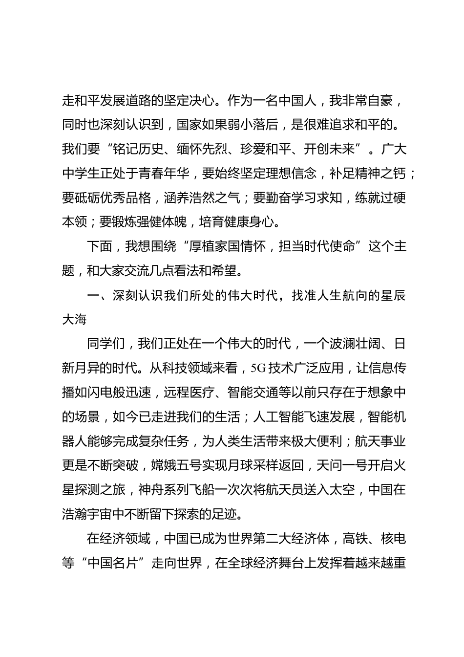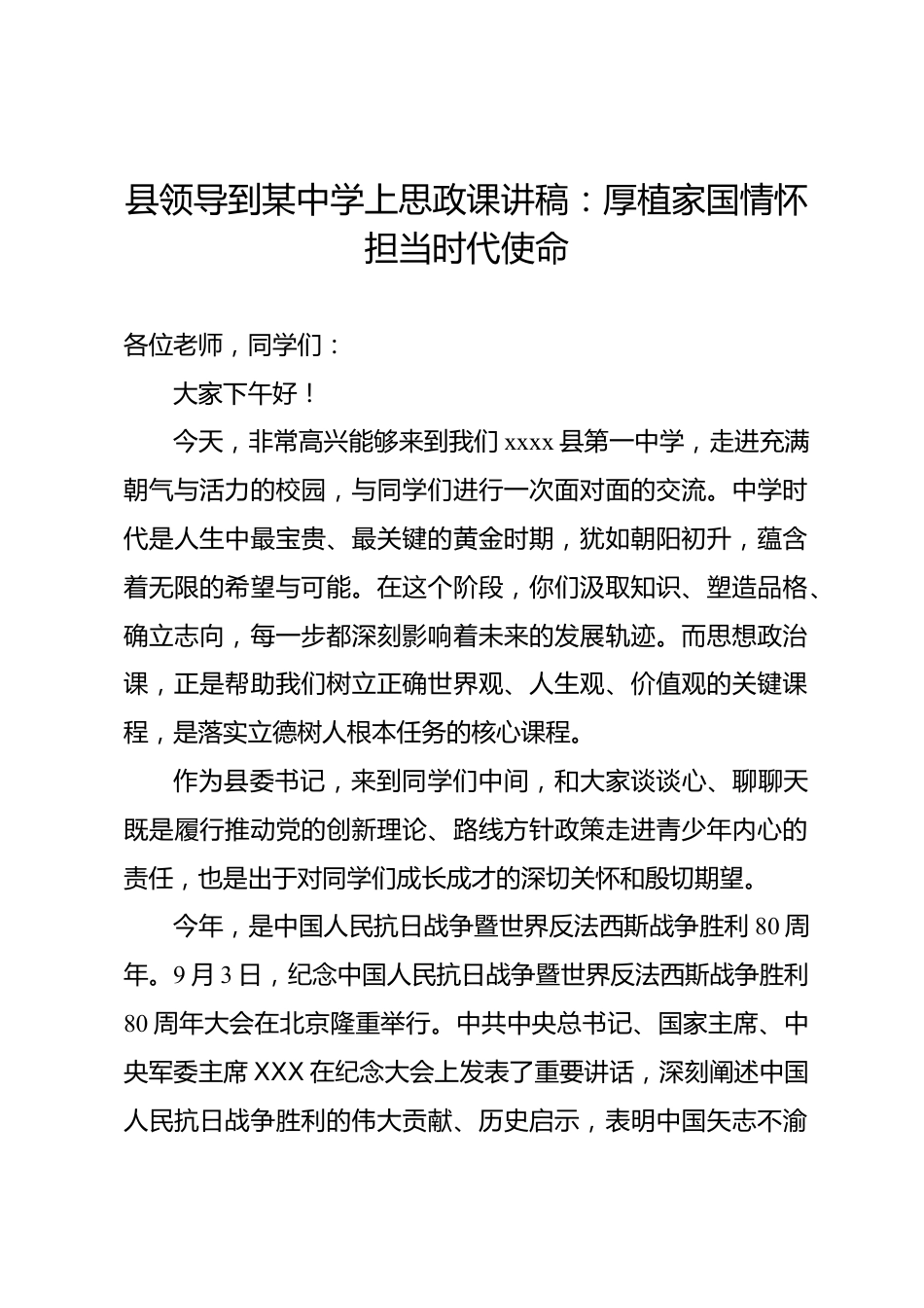 縣領(lǐng)導(dǎo)到某中學(xué)上思政課講稿:厚植家國情懷擔(dān)當(dāng)時代使命
