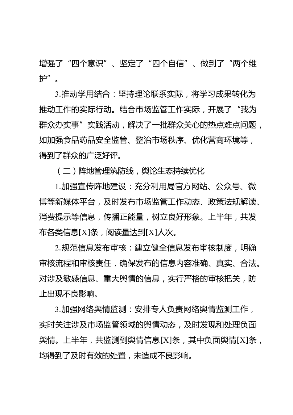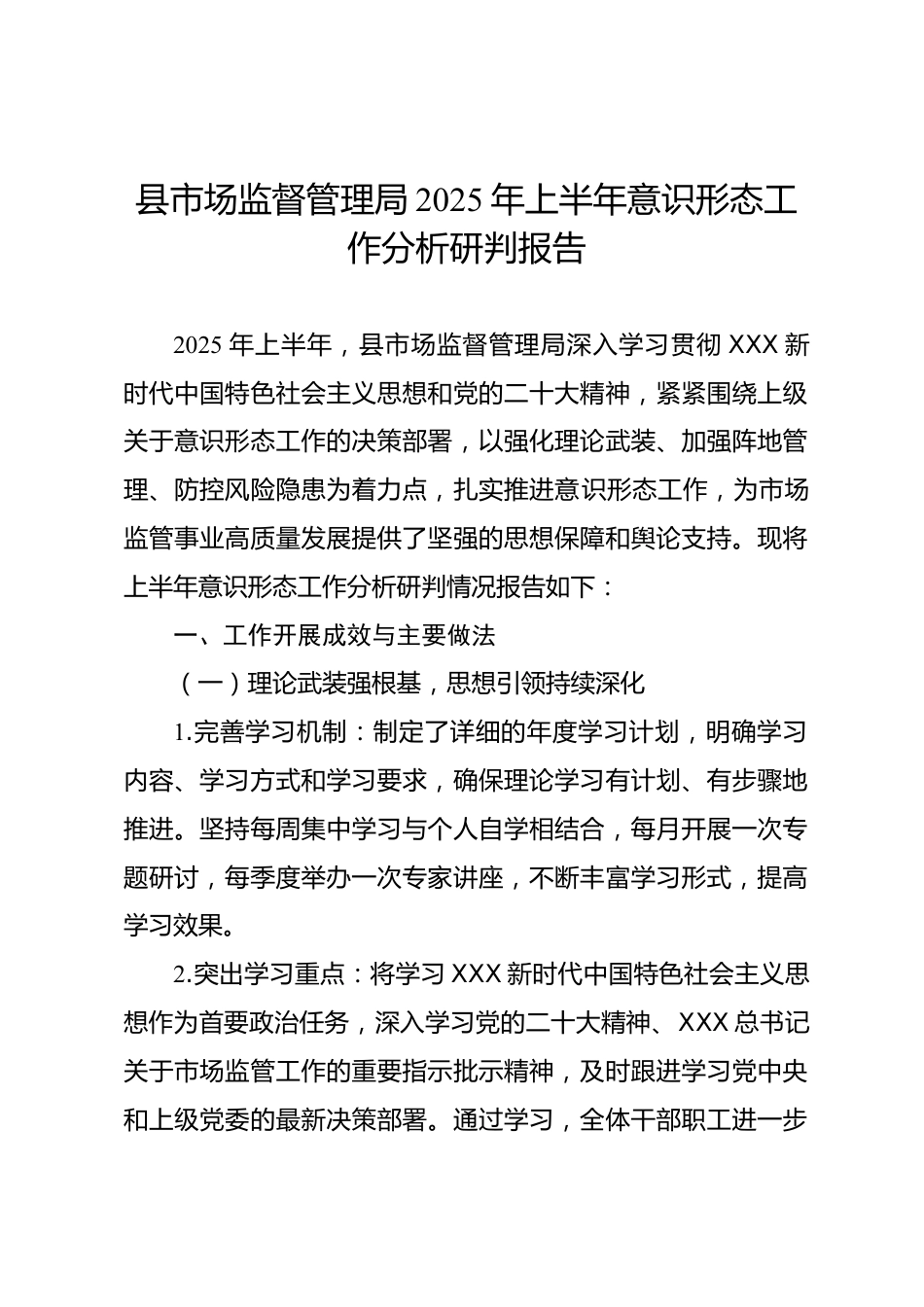 縣市場監(jiān)督管理局2025年上半年意識形態(tài)工作分析研判報告2025年上半年,縣市場監(jiān)督管理局深入學(xué)習(xí)貫徹XXX新時代中國特色社會主義思想和黨的二十大精神,緊緊圍繞上級關(guān)于意識形態(tài)工作的決策部署,以強化理論武裝、加強陣地管理、防控風(fēng)險隱患為著力點,扎實推進意識形態(tài)工作,為市場監(jiān)管事業(yè)高質(zhì)量發(fā)展提供了堅強的思想保障和輿論支持?,F(xiàn)將上半年意識形態(tài)工作分析研判情況報告如下:一、工作開展成效與主要做法(一)理論武裝強根基,思想引領(lǐng)持續(xù)深化1.完善學(xué)習(xí)機制:制定了詳細的年度學(xué)習(xí)計劃,明確學(xué)習(xí)內(nèi)容、學(xué)習(xí)方式和學(xué)習(xí)要求,確保理論學(xué)習(xí)有計劃、有步驟地推進。...