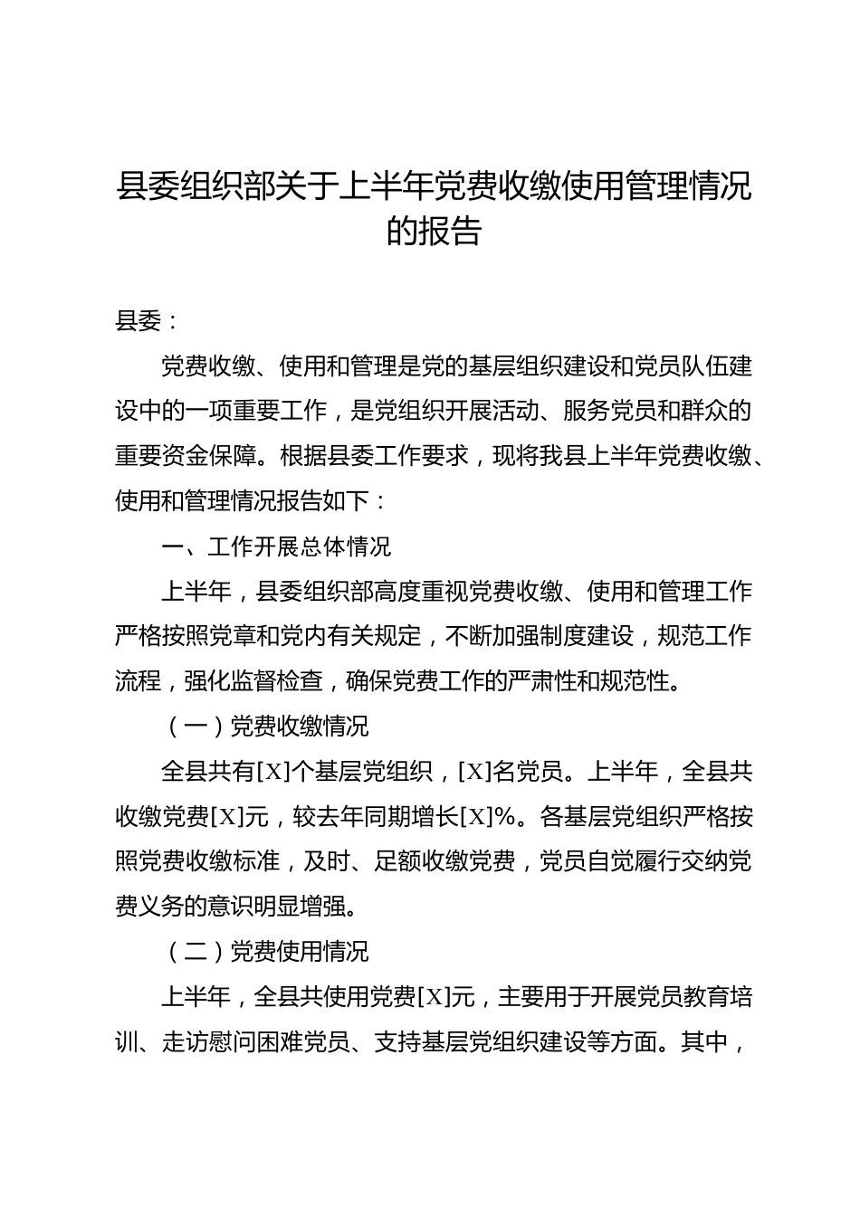 縣委組織部關(guān)于上半年黨費(fèi)收繳使用管理情況的報(bào)告縣委:黨費(fèi)收繳、使用和管理是黨的基層組織建設(shè)和黨員隊(duì)伍建設(shè)中的一項(xiàng)重要工作,是黨組織開展活動、服務(wù)黨員和群眾的重要資金保障。根據(jù)縣委工作要求,現(xiàn)將我縣上半年黨費(fèi)收繳、使用和管理情況報(bào)告如下:一、工作開展總體情況上半年,縣委組織部高度重視黨費(fèi)收繳、使用和管理工作嚴(yán)格按照黨章和黨內(nèi)有關(guān)規(guī)定,不斷加強(qiáng)制度建設(shè),規(guī)范工作流程,強(qiáng)化監(jiān)督檢查,確保黨費(fèi)工作的嚴(yán)肅性和規(guī)范性。(一)黨費(fèi)收繳情況全縣共有[X]個(gè)基層黨組織,[X]名黨員。上半年,全縣共收繳黨費(fèi)[X]元,較去年同期增長[X]%。各基層黨組織嚴(yán)格...