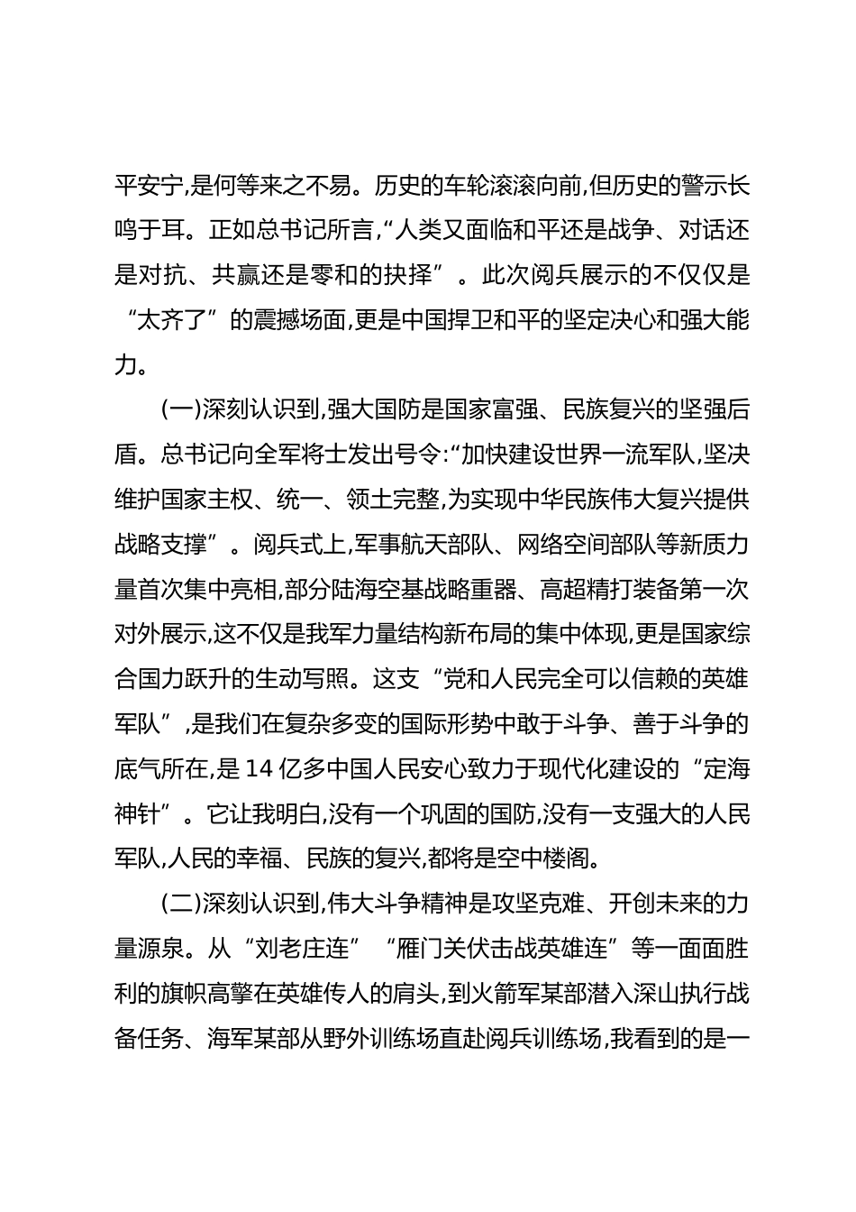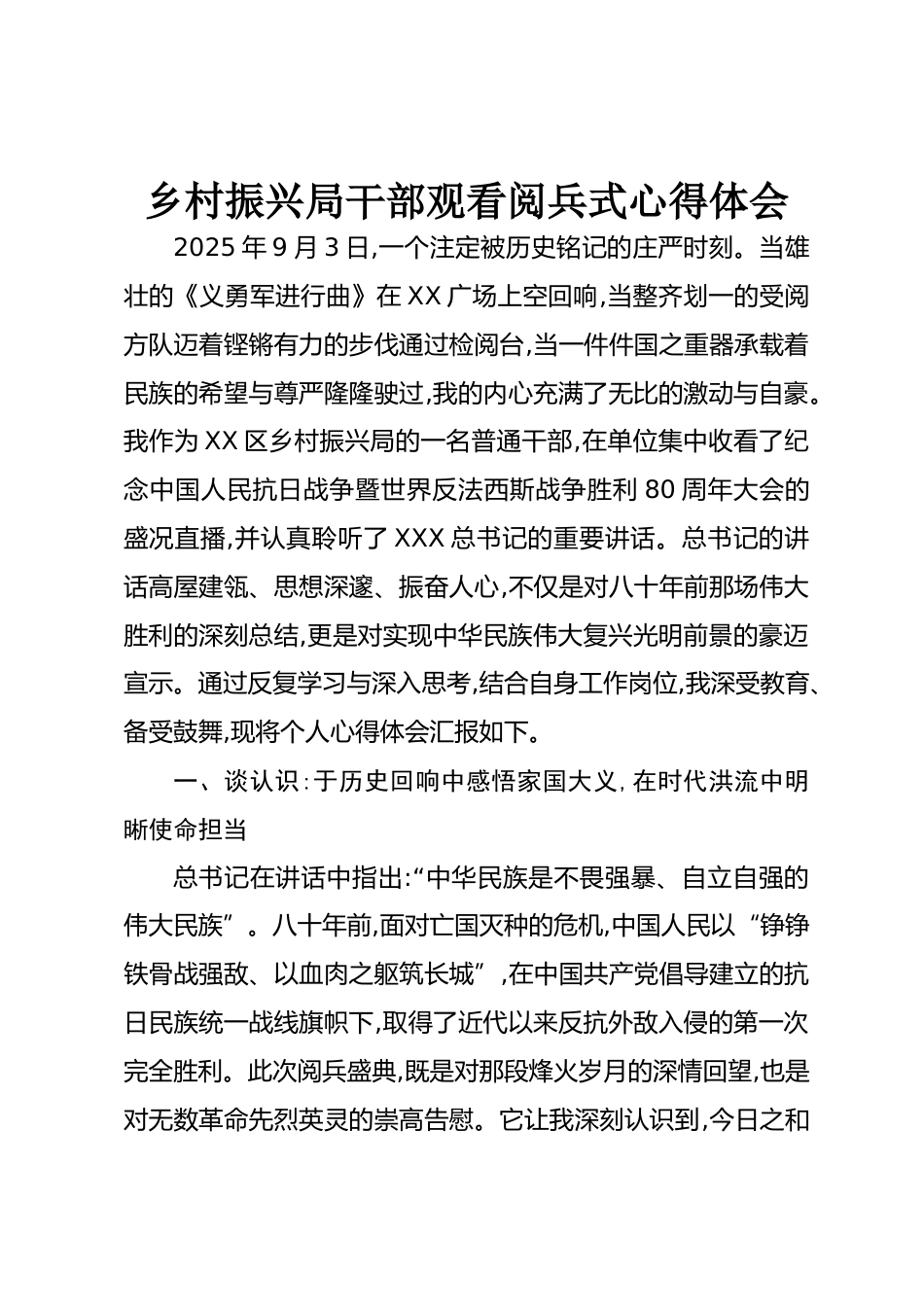 鄉(xiāng)村振興局干部觀看閱兵式心得體會2025年9月3日,一個注定被歷史銘記的莊嚴(yán)時刻。當(dāng)雄壯的《義勇軍進(jìn)行曲》在XX廣場上空回響,當(dāng)整齊劃一的受閱方隊邁著鏗鏘有力的步伐通過檢閱臺,當(dāng)一件件國之重器承載著民族的希望與尊嚴(yán)隆隆駛過,我的內(nèi)心充滿了無比的激動與自豪。我作為XX區(qū)鄉(xiāng)村振興局的一名普通干部,在單位集中收看了紀(jì)念中國人民抗日戰(zhàn)爭暨世界反法西斯戰(zhàn)爭勝利80周年大會的盛況直播,并認(rèn)真聆聽了XXX總書記的重要講話??倳浀闹v話高屋建瓴、思想深邃、振奮人心,不僅是對八十年前那場偉大勝利的深刻總結(jié),更是對實現(xiàn)中華民族偉大復(fù)興光明前景的豪邁宣示。通過反復(fù)學(xué)習(xí)...