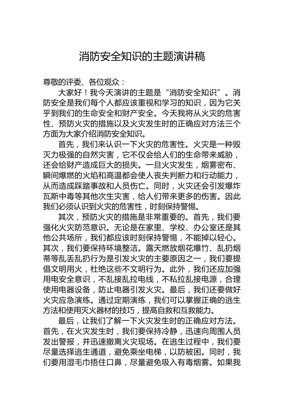 消防安全知識的主題演講稿尊敬的評委、各位觀眾:大家好!我今天演講的主題是“消防安全知識”。消防安全是我們每個人都應(yīng)該重視和學(xué)習(xí)的知識,因為它關(guān)乎到我們的生命安全和財產(chǎn)安全。今天我將從火災(zāi)的危害性、預(yù)防火災(zāi)的措施以及火災(zāi)發(fā)生時的正確應(yīng)對方法三個方面為大家介紹消防安全知識。首先,我們來認(rèn)識一下火災(zāi)的危害性?;馂?zāi)是一種毀滅力極強的自然災(zāi)害,它不僅會給人們的生命帶來威脅,還會給財產(chǎn)造成巨大的損失。一旦火災(zāi)發(fā)生,煙霧密布、瞬間爆燃的火焰和高溫都會使人喪失判斷力和行動能力,從而造成踩踏事故和人員傷亡。同時,火災(zāi)還會引發(fā)爆炸瓦斯中毒等其他...