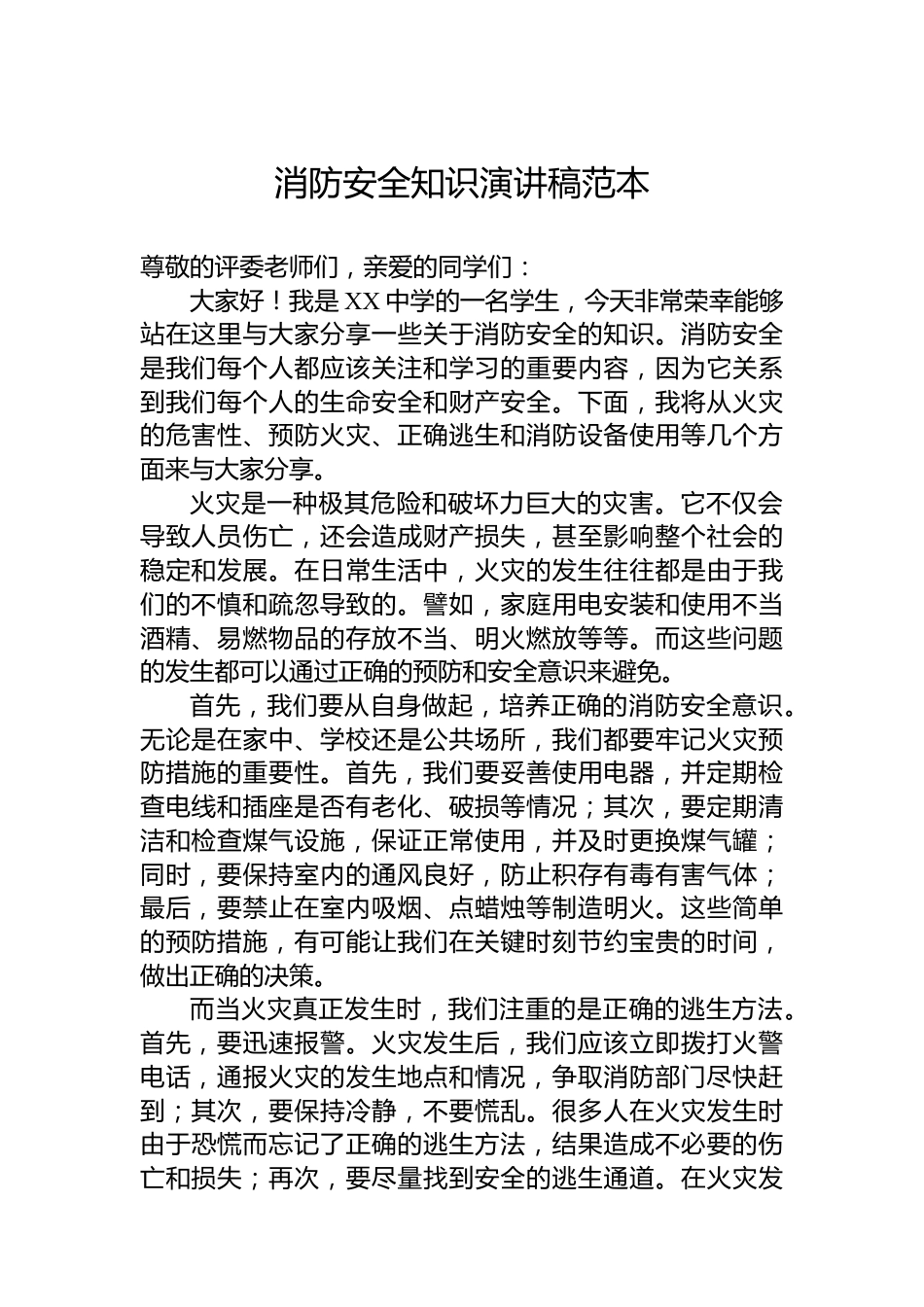 消防安全知識演講稿范本尊敬的評委老師們,親愛的同學們:大家好!我是XX中學的一名學生,今天非常榮幸能夠站在這里與大家分享一些關(guān)于消防安全的知識。消防安全是我們每個人都應(yīng)該關(guān)注和學習的重要內(nèi)容,因為它關(guān)系到我們每個人的生命安全和財產(chǎn)安全。下面,我將從火災(zāi)的危害性、預防火災(zāi)、正確逃生和消防設(shè)備使用等幾個方面來與大家分享?;馂?zāi)是一種極其危險和破壞力巨大的災(zāi)害。它不僅會導致人員傷亡,還會造成財產(chǎn)損失,甚至影響整個社會的穩(wěn)定和發(fā)展。在日常生活中,火災(zāi)的發(fā)生往往都是由于我們的不慎和疏忽導致的。譬如,家庭用電安裝和使用不當酒精、易燃物品的存...