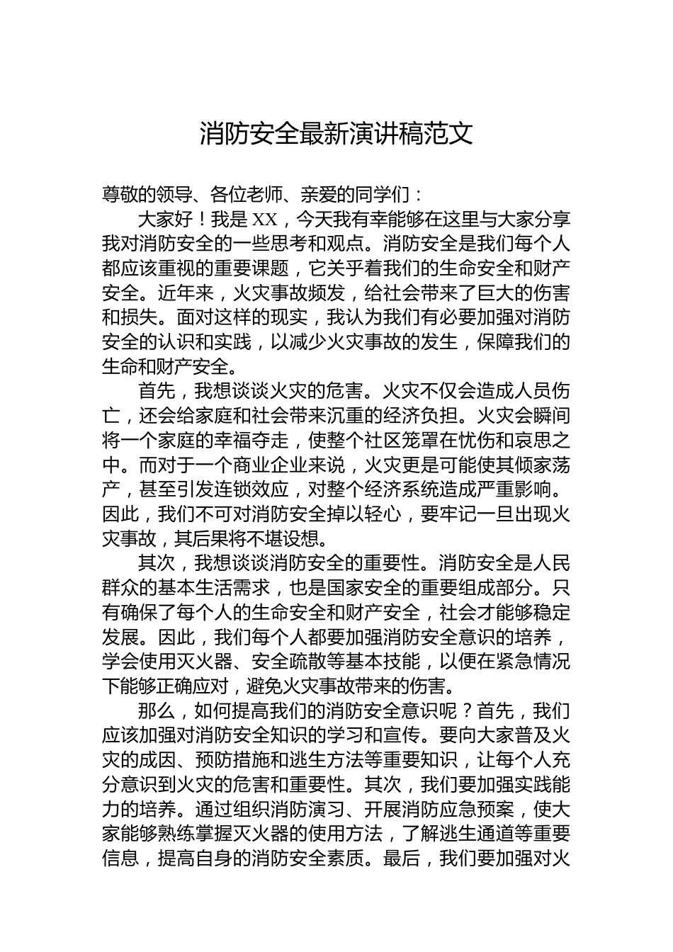 消防安全最新演講稿范文尊敬的領導、各位老師、親愛的同學們:大家好!我是XX,今天我有幸能夠在這里與大家分享我對消防安全的一些思考和觀點。消防安全是我們每個人都應該重視的重要課題,它關(guān)乎著我們的生命安全和財產(chǎn)安全。近年來,火災事故頻發(fā),給社會帶來了巨大的傷害和損失。面對這樣的現(xiàn)實,我認為我們有必要加強對消防安全的認識和實踐,以減少火災事故的發(fā)生,保障我們的生命和財產(chǎn)安全。首先,我想談談火災的危害。火災不僅會造成人員傷亡,還會給家庭和社會帶來沉重的經(jīng)濟負擔?;馂臅查g將一個家庭的幸福奪走,使整個社區(qū)籠罩在憂傷和哀思之中。而對于一個...