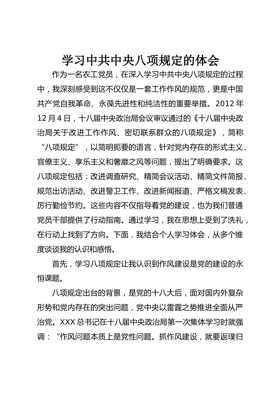 學(xué)習(xí)中共中央八項(xiàng)規(guī)定的體會(huì)作為一名農(nóng)工黨員,在深入學(xué)習(xí)中共中央八項(xiàng)規(guī)定的過程中,我深刻感受到這不僅僅是一套工作作風(fēng)的規(guī)范,更是中國共產(chǎn)黨自我革命、永葆先進(jìn)性和純潔性的重要舉措。2012年12月4日,十八屆中央政治局會(huì)議審議通過的《十八屆中央政治局關(guān)于改進(jìn)工作作風(fēng)、密切聯(lián)系群眾的八項(xiàng)規(guī)定》,簡稱“八項(xiàng)規(guī)定”,以簡明扼要的語言,針對黨內(nèi)存在的形式主義、官僚主義、享樂主義和奢靡之風(fēng)等問題,提出了明確要求。這八項(xiàng)規(guī)定包括:改進(jìn)調(diào)查研究、精簡會(huì)議活動(dòng)、精簡文件簡報(bào)、規(guī)范出訪活動(dòng)、改進(jìn)警衛(wèi)工作、改進(jìn)新聞報(bào)道、嚴(yán)格文稿發(fā)表、厲行勤儉節(jié)約。這些內(nèi)...