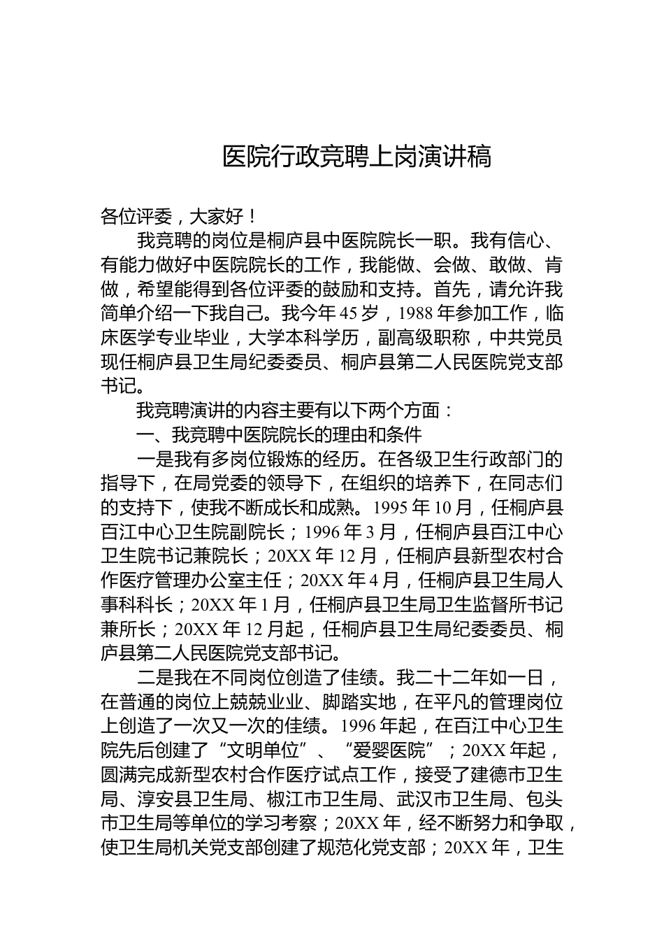 醫(yī)院行政競(jìng)聘上崗演講稿各位評(píng)委,大家好!我競(jìng)聘的崗位是桐廬縣中醫(yī)院院長(zhǎng)一職。我有信心、有能力做好中醫(yī)院院長(zhǎng)的工作,我能做、會(huì)做、敢做、肯做,希望能得到各位評(píng)委的鼓勵(lì)和支持。首先,請(qǐng)?jiān)试S我簡(jiǎn)單介紹一下我自己。我今年45歲,1988年參加工作,臨床醫(yī)學(xué)專業(yè)畢業(yè),大學(xué)本科學(xué)歷,副高級(jí)職稱,中共黨員現(xiàn)任桐廬縣衛(wèi)生局紀(jì)委委員、桐廬縣第二人民醫(yī)院黨支部書記。我競(jìng)聘演講的內(nèi)容主要有以下兩個(gè)方面:一、我競(jìng)聘中醫(yī)院院長(zhǎng)的理由和條件一是我有多崗位鍛煉的經(jīng)歷。在各級(jí)衛(wèi)生行政部門的指導(dǎo)下,在局黨委的領(lǐng)導(dǎo)下,在組織的培養(yǎng)下,在同志們的支持下,使我不斷成長(zhǎng)和...