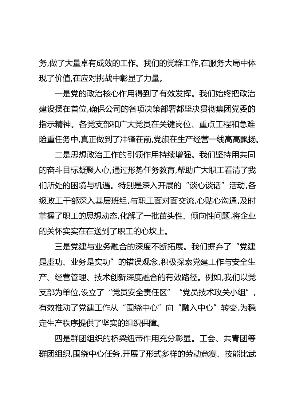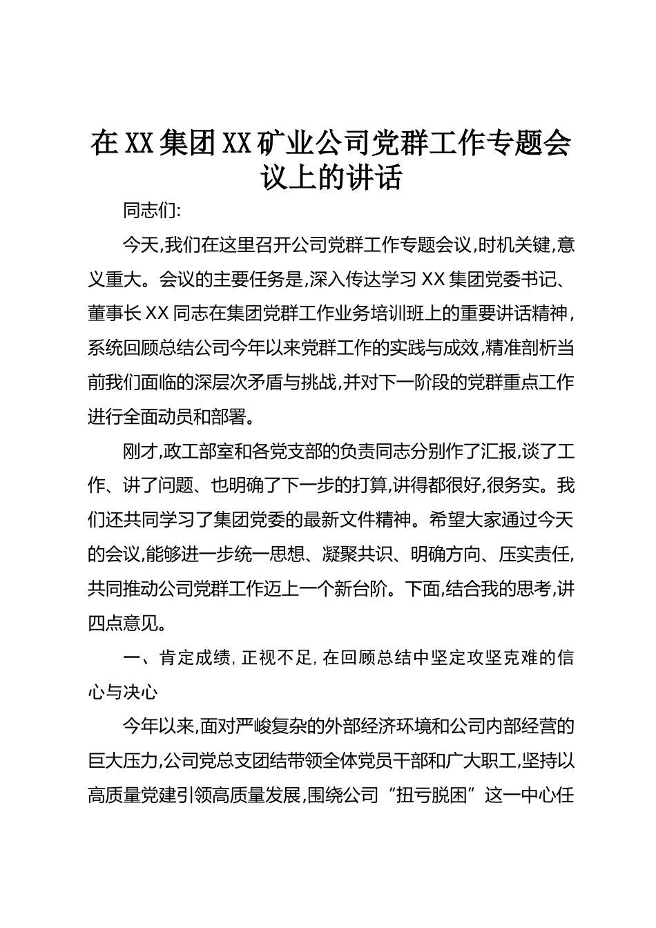 在XX集團(tuán)XX礦業(yè)公司黨群工作專題會(huì)議上的講話同志們:今天,我們?cè)谶@里召開(kāi)公司黨群工作專題會(huì)議,時(shí)機(jī)關(guān)鍵,意義重大。會(huì)議的主要任務(wù)是,深入傳達(dá)學(xué)習(xí)XX集團(tuán)黨委書(shū)記、董事長(zhǎng)XX同志在集團(tuán)黨群工作業(yè)務(wù)培訓(xùn)班上的重要講話精神,系統(tǒng)回顧總結(jié)公司今年以來(lái)黨群工作的實(shí)踐與成效,精準(zhǔn)剖析當(dāng)前我們面臨的深層次矛盾與挑戰(zhàn),并對(duì)下一階段的黨群重點(diǎn)工作進(jìn)行全面動(dòng)員和部署。剛才,政工部室和各黨支部的負(fù)責(zé)同志分別作了匯報(bào),談了工作、講了問(wèn)題、也明確了下一步的打算,講得都很好,很務(wù)實(shí)。我們還共同學(xué)習(xí)了集團(tuán)黨委的最新文件精神。希望大家通過(guò)今天的會(huì)議,能夠進(jìn)一步統(tǒng)一思想、凝聚...