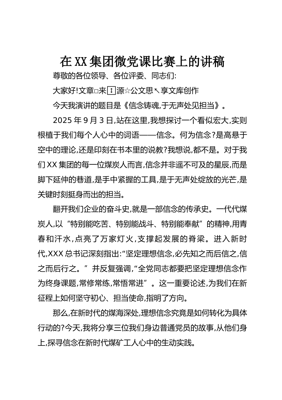 在XX集團微黨課比賽上的講稿尊敬的各位領(lǐng)導(dǎo)、各位評委、同志們:大家好!文章□來源☆公文思↖享文庫創(chuàng)作?今天我演講的題目是《信念鑄魂,于無聲處見擔(dān)當(dāng)》。2025年9月3日,站在這里,我想探討一個看似宏大,實則根植于我們每個人心中的詞語——信念。何為信念?是高懸于空中的理論,還是印刻在書本里的說教?我想說,都不是。對于我們XX集團的每一位煤炭人而言,信念并非遙不可及的星辰,而是腳下延伸的巷道,是手中緊握的工具,是于無聲處綻放的光芒,是關(guān)鍵時刻挺身而出的擔(dān)當(dāng)。翻開我們企業(yè)的奮斗史,就是一部信念的傳承史。一代代煤炭人,以“特別能吃苦、特別能戰(zhàn)斗、特別能奉獻”...