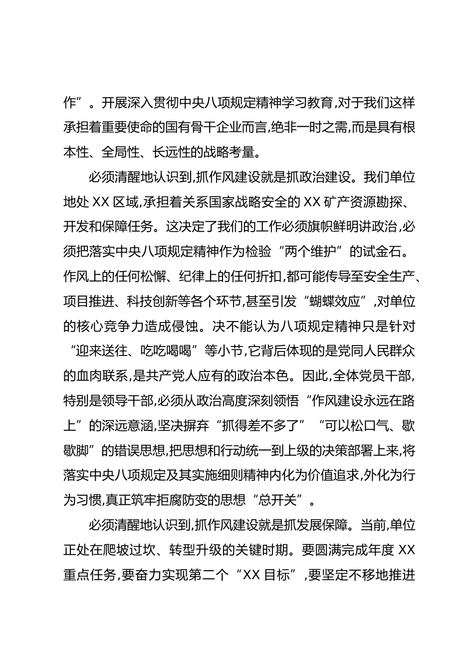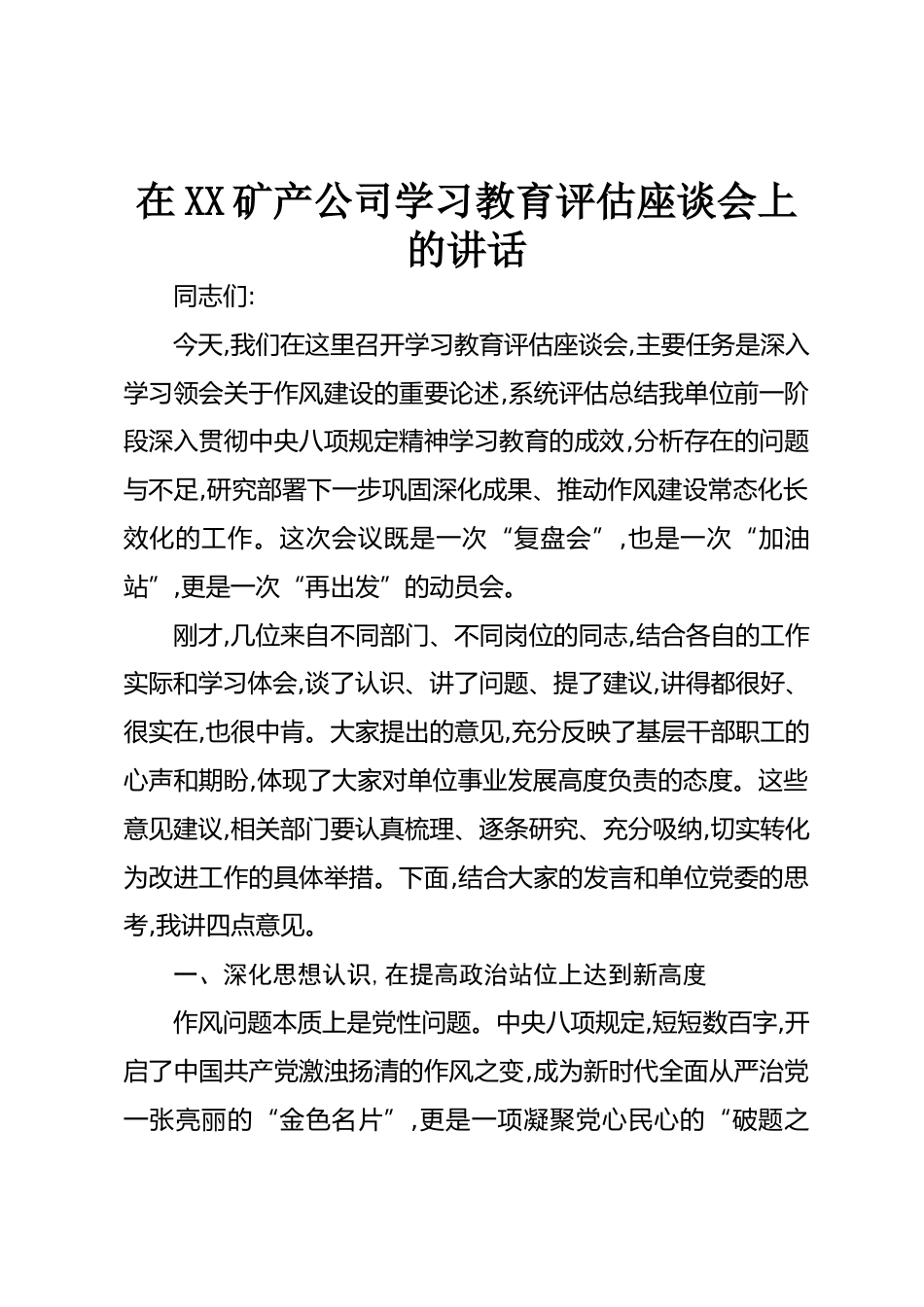 在XX礦產(chǎn)公司八項(xiàng)規(guī)定學(xué)習(xí)教育評(píng)估座談會(huì)上的講話