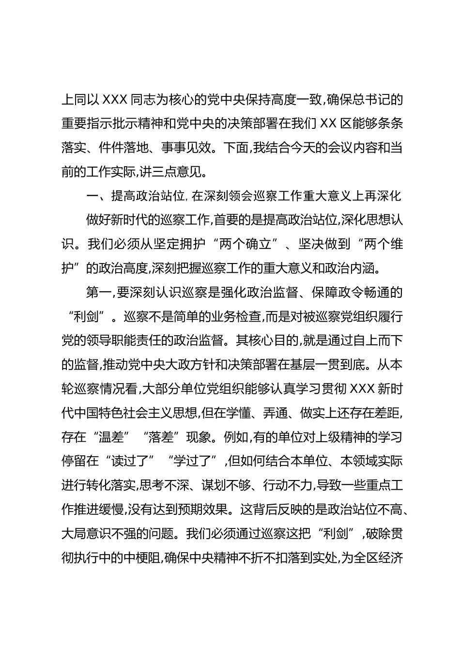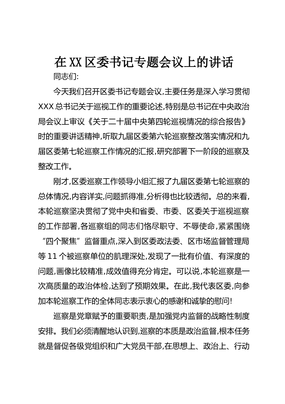 在XX區(qū)委書記專題會(huì)議上的講話同志們:今天我們召開區(qū)委書記專題會(huì)議,主要任務(wù)是深入學(xué)習(xí)貫徹XXX總書記關(guān)于巡視工作的重要論述,特別是總書記在中央政治局會(huì)議上審議《關(guān)于二十屆中央第四輪巡視情況的綜合報(bào)告》時(shí)的重要講話精神,聽取九屆區(qū)委第六輪巡察整改落實(shí)情況和九屆區(qū)委第七輪巡察工作情況的匯報(bào),研究部署下一階段的巡察及整改工作。剛才,區(qū)委巡察工作領(lǐng)導(dǎo)小組匯報(bào)了九屆區(qū)委第七輪巡察的總體情況,內(nèi)容詳實(shí),問題抓得準(zhǔn),分析得也比較透徹??偟膩砜?本輪巡察堅(jiān)決貫徹了黨中央和省委、市委、區(qū)委關(guān)于巡視巡察的工作部署,各巡察組的同志們恪盡職守、不辱使命,緊緊圍繞...