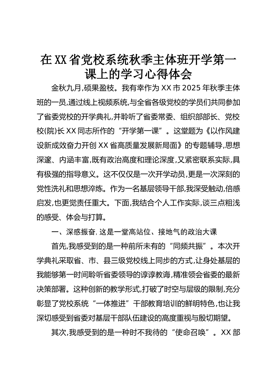 在XX省黨校系統(tǒng)秋季主體班開學(xué)第一課上的學(xué)習(xí)心得體會(huì)金秋九月,碩果盈枝。我有幸作為XX市2025年秋季主體班的一員,通過(guò)線上視頻系統(tǒng),與全省各級(jí)黨校的學(xué)員們共同參加了省委黨校的開學(xué)典禮,并聆聽了省委常委、組織部部長(zhǎng)、黨校校(院)長(zhǎng)XX同志所作的“開學(xué)第一課”。這堂題為《以作風(fēng)建設(shè)新成效奮力開創(chuàng)XX省高質(zhì)量發(fā)展新局面》的專題輔導(dǎo),思想深邃、內(nèi)涵豐富,既有政治高度和理論深度,又緊密聯(lián)系實(shí)際,具有極強(qiáng)的指導(dǎo)意義。這不僅僅是一次開學(xué)動(dòng)員,更是一次深刻的黨性洗禮和思想淬煉。作為一名基層領(lǐng)導(dǎo)干部,我深受觸動(dòng),倍感啟發(fā),也更覺責(zé)任重大。下面,我結(jié)合個(gè)人工作實(shí)際,談三...