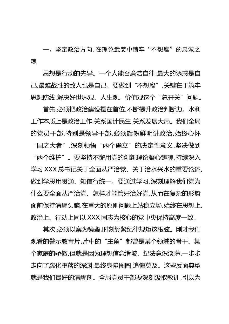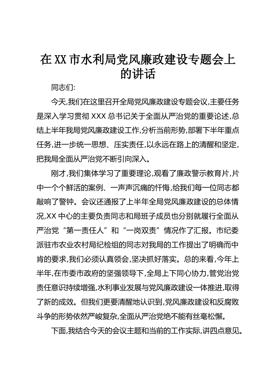 在XX市水利局黨風廉政建設專題會上的講話同志們:今天,我們在這里召開全局黨風廉政建設專題會議,主要任務是深入學習貫徹XXX總書記關于全面從嚴治黨的重要論述,總結上半年我局黨風廉政建設工作,分析當前形勢,部署下半年重點任務,進一步統(tǒng)一思想、壓實責任,以永遠在路上的清醒和堅定,把我局全面從嚴治黨不斷引向深入。剛才,我們集體學習了重要理論,觀看了廉政警示教育片,片中一個個鮮活的案例、一聲聲沉痛的懺悔,給我們每一位同志都敲響了警鐘。會議還通報了上半年全局黨風廉政建設的總體情況,XX中心的主要負責同志和局班子成員也分別就履行全面從嚴治黨“第一責任人”和“...