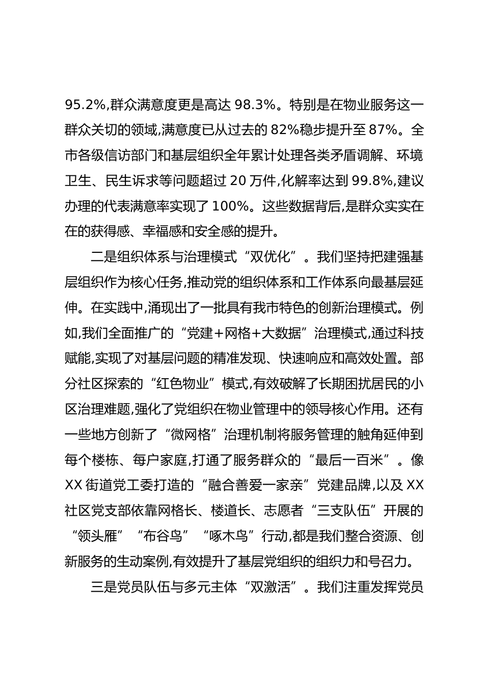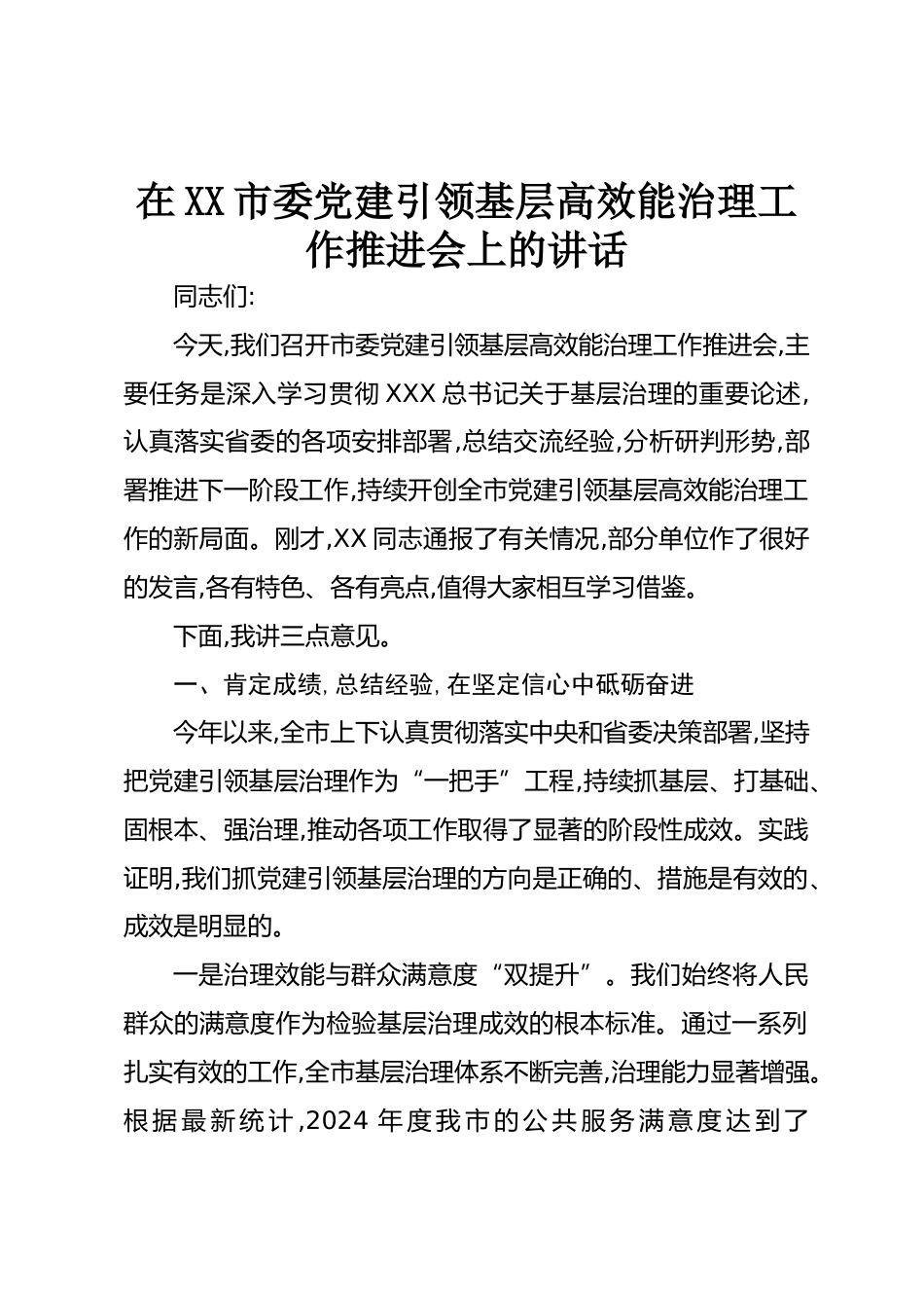 在XX市委黨建引領(lǐng)基層高效能治理工作推進(jìn)會(huì)上的講話同志們:今天,我們召開市委黨建引領(lǐng)基層高效能治理工作推進(jìn)會(huì),主要任務(wù)是深入學(xué)習(xí)貫徹XXX總書記關(guān)于基層治理的重要論述,認(rèn)真落實(shí)省委的各項(xiàng)安排部署,總結(jié)交流經(jīng)驗(yàn),分析研判形勢(shì),部署推進(jìn)下一階段工作,持續(xù)開創(chuàng)全市黨建引領(lǐng)基層高效能治理工作的新局面。剛才,XX同志通報(bào)了有關(guān)情況,部分單位作了很好的發(fā)言,各有特色、各有亮點(diǎn),值得大家相互學(xué)習(xí)借鑒。下面,我講三點(diǎn)意見。一、肯定成績(jī),總結(jié)經(jīng)驗(yàn),在堅(jiān)定信心中砥礪奮進(jìn)今年以來(lái),全市上下認(rèn)真貫徹落實(shí)中央和省委決策部署,堅(jiān)持把黨建引領(lǐng)基層治理作為“一把手”工程,持續(xù)抓基...
