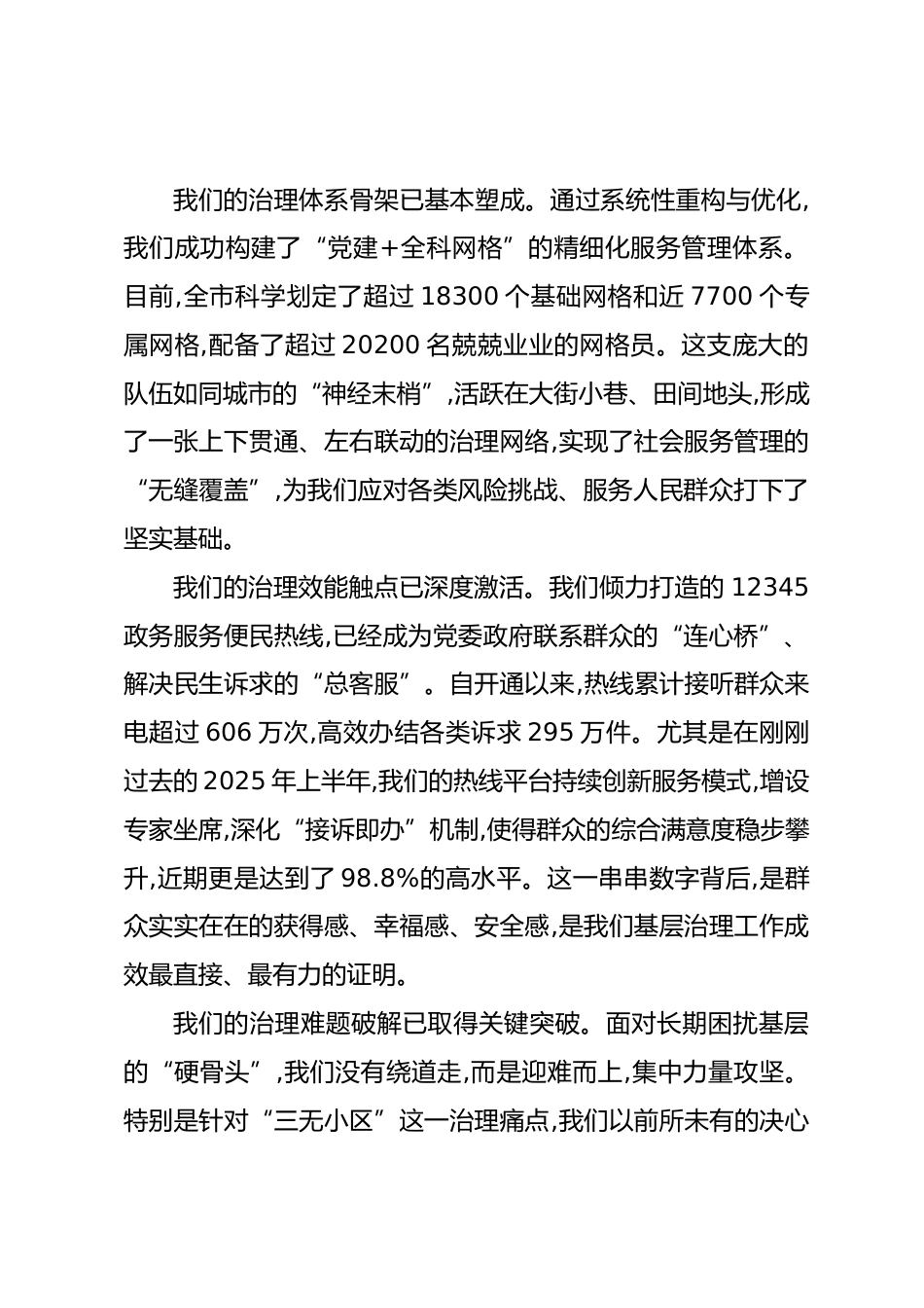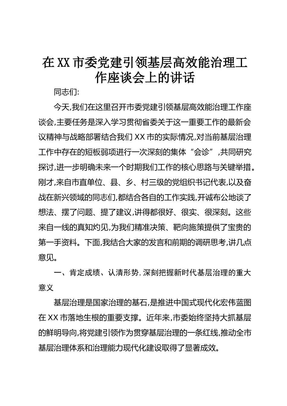 在XX市委黨建引領(lǐng)基層高效能治理工作座談會上的講話同志們:今天,我們在這里召開市委黨建引領(lǐng)基層高效能治理工作座談會,主要任務(wù)是深入學(xué)習貫徹省委關(guān)于這一重要工作的最新會議精神與戰(zhàn)略部署結(jié)合我們XX市的實際情況,對當前基層治理工作中存在的短板弱項進行一次深刻的集體“會診”,共同研究探討,進一步明確未來一個時期我們工作的核心思路與關(guān)鍵舉措。剛才,來自市直單位、縣、鄉(xiāng)、村三級的黨組織書記代表,以及奮戰(zhàn)在新興領(lǐng)域的同志們,都結(jié)合各自的工作實踐,開誠布公地談了想法、擺了問題、提了建議,講得都很好、很實、很深刻。這些來自一線的真知灼見,為我們精準決策、靶...