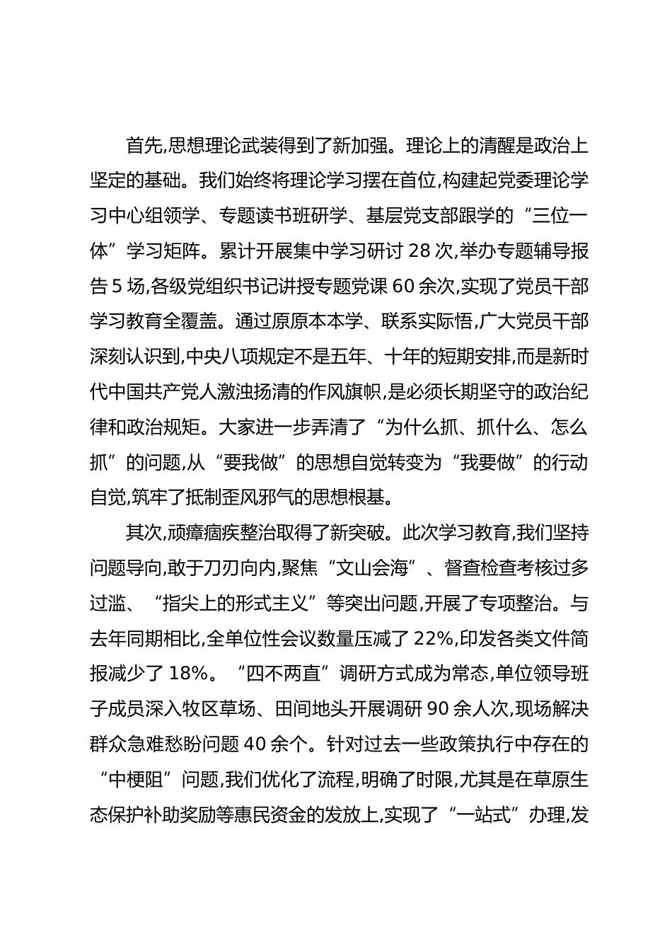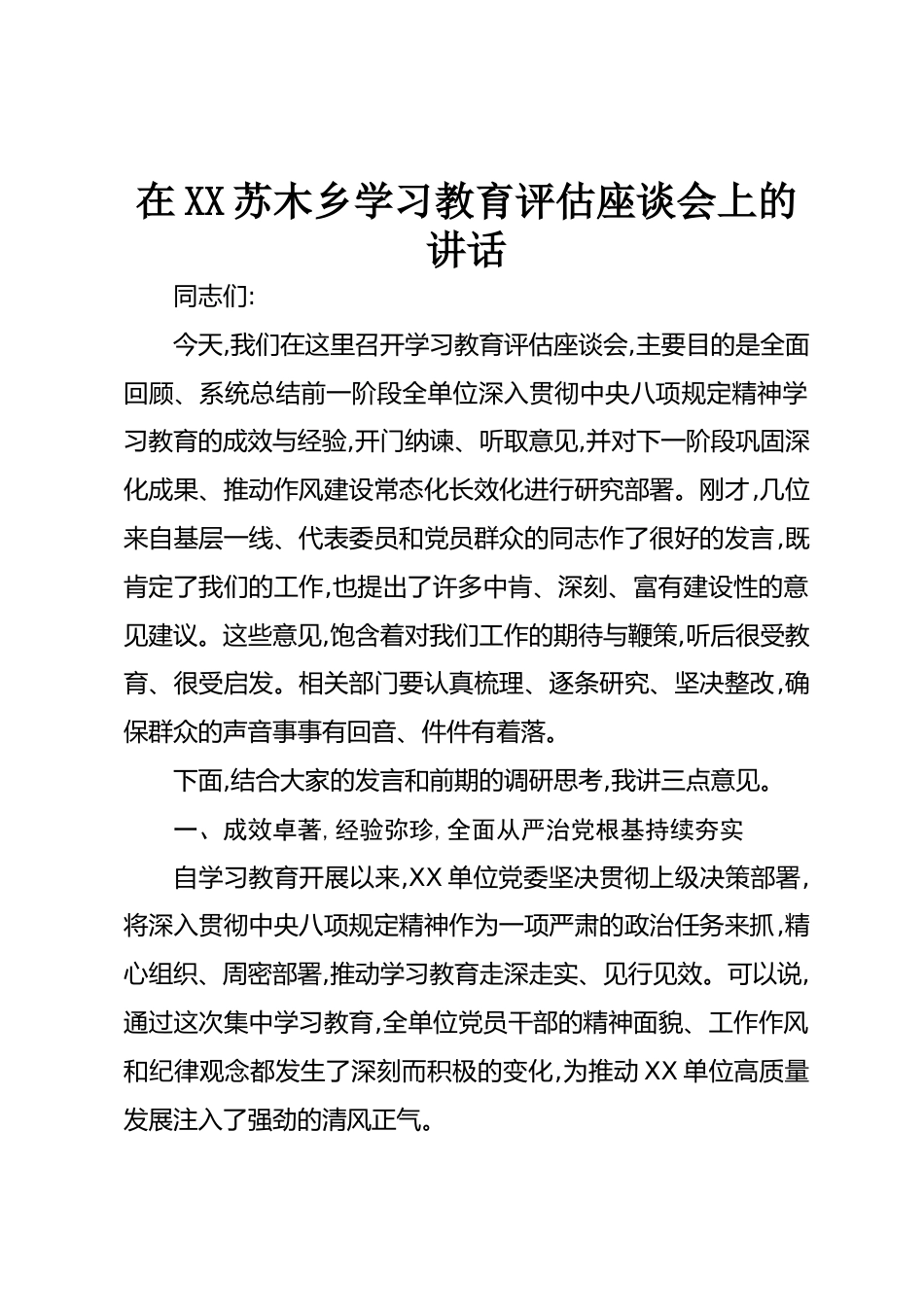 在XX蘇木鄉(xiāng)學(xué)習(xí)教育評(píng)估座談會(huì)上的講話同志們:今天,我們?cè)谶@里召開(kāi)學(xué)習(xí)教育評(píng)估座談會(huì),主要目的是全面回顧、系統(tǒng)總結(jié)前一階段全單位深入貫徹中央八項(xiàng)規(guī)定精神學(xué)習(xí)教育的成效與經(jīng)驗(yàn),開(kāi)門(mén)納諫、聽(tīng)取意見(jiàn),并對(duì)下一階段鞏固深化成果、推動(dòng)作風(fēng)建設(shè)常態(tài)化長(zhǎng)效化進(jìn)行研究部署。剛才,幾位來(lái)自基層一線、代表委員和黨員群眾的同志作了很好的發(fā)言,既肯定了我們的工作,也提出了許多中肯、深刻、富有建設(shè)性的意見(jiàn)建議。這些意見(jiàn),飽含著對(duì)我們工作的期待與鞭策,聽(tīng)后很受教育、很受啟發(fā)。相關(guān)部門(mén)要認(rèn)真梳理、逐條研究、堅(jiān)決整改,確保群眾的聲音事事有回音、件件有著落。下面,結(jié)合大家...