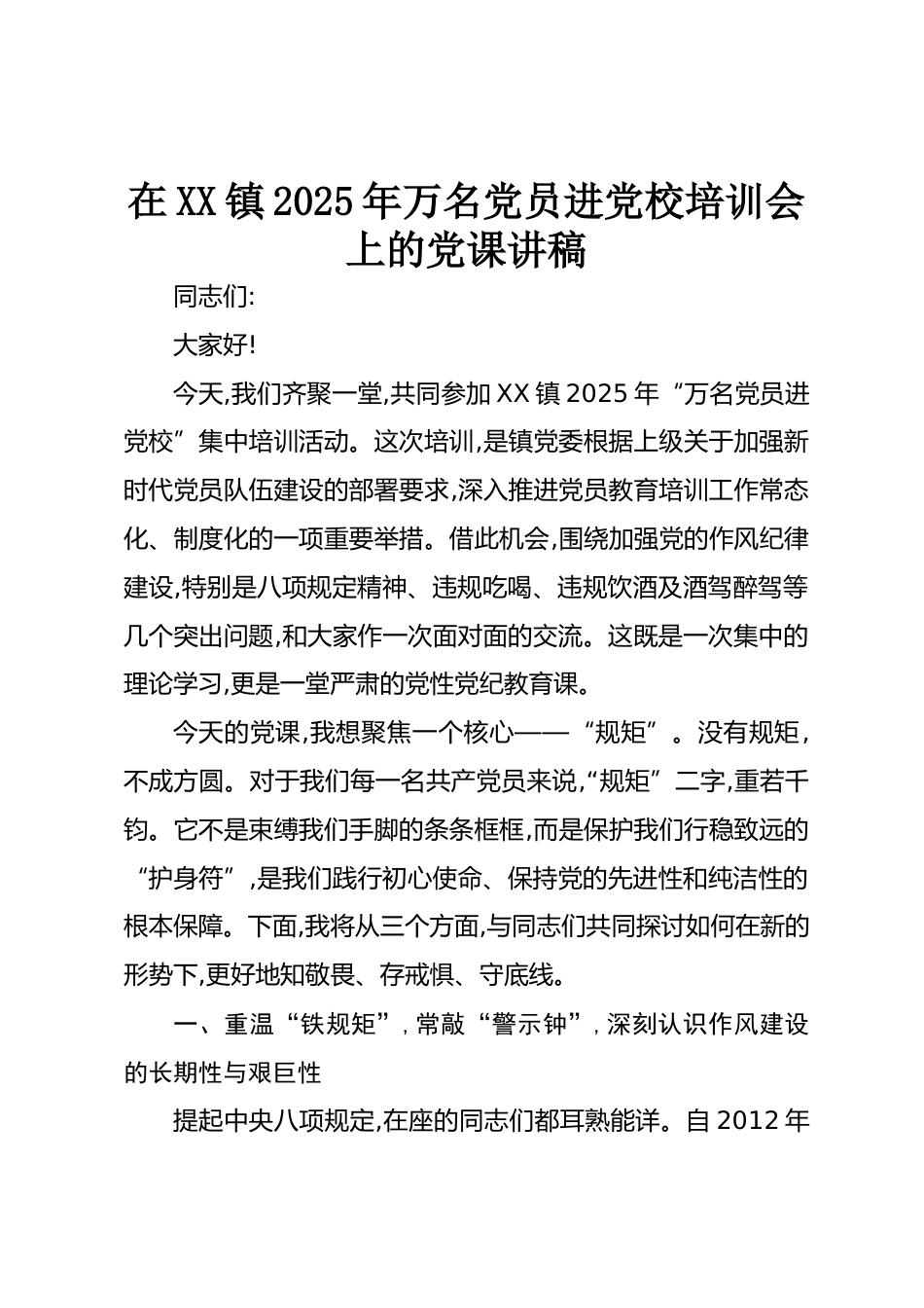 在XX鎮(zhèn)2025年萬名黨員進黨校培訓(xùn)會上的黨課講稿同志們:大家好!今天,我們齊聚一堂,共同參加XX鎮(zhèn)2025年“萬名黨員進黨?!奔信嘤?xùn)活動。這次培訓(xùn),是鎮(zhèn)黨委根據(jù)上級關(guān)于加強新時代黨員隊伍建設(shè)的部署要求,深入推進黨員教育培訓(xùn)工作常態(tài)化、制度化的一項重要舉措。借此機會,圍繞加強黨的作風(fēng)紀(jì)律建設(shè),特別是八項規(guī)定精神、違規(guī)吃喝、違規(guī)飲酒及酒駕醉駕等幾個突出問題,和大家作一次面對面的交流。這既是一次集中的理論學(xué)習(xí),更是一堂嚴肅的黨性黨紀(jì)教育課。今天的黨課,我想聚焦一個核心——“規(guī)矩”。沒有規(guī)矩,不成方圓。對于我們每一名共產(chǎn)黨員來說,“規(guī)矩”二字,重若千鈞。...