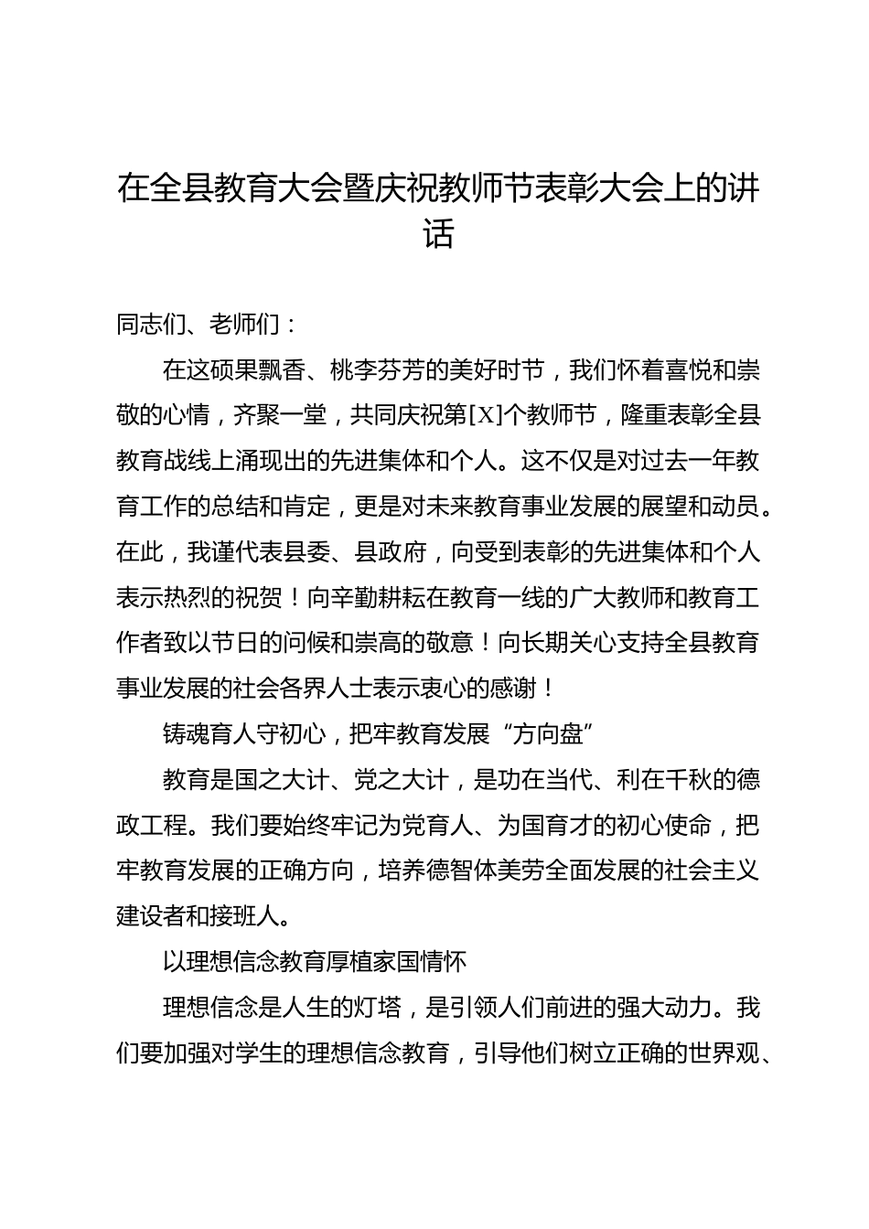 在全縣教育大會(huì)暨慶祝教師節(jié)表彰大會(huì)上的講話同志們、老師們:在這碩果飄香、桃李芬芳的美好時(shí)節(jié),我們懷著喜悅和崇敬的心情,齊聚一堂,共同慶祝第[X]個(gè)教師節(jié),隆重表彰全縣教育戰(zhàn)線上涌現(xiàn)出的先進(jìn)集體和個(gè)人。這不僅是對(duì)過去一年教育工作的總結(jié)和肯定,更是對(duì)未來教育事業(yè)發(fā)展的展望和動(dòng)員。在此,我謹(jǐn)代表縣委、縣政府,向受到表彰的先進(jìn)集體和個(gè)人表示熱烈的祝賀!向辛勤耕耘在教育一線的廣大教師和教育工作者致以節(jié)日的問候和崇高的敬意!向長(zhǎng)期關(guān)心支持全縣教育事業(yè)發(fā)展的社會(huì)各界人士表示衷心的感謝!鑄魂育人守初心,把牢教育發(fā)展“方向盤”教育是國(guó)之大計(jì)、黨...