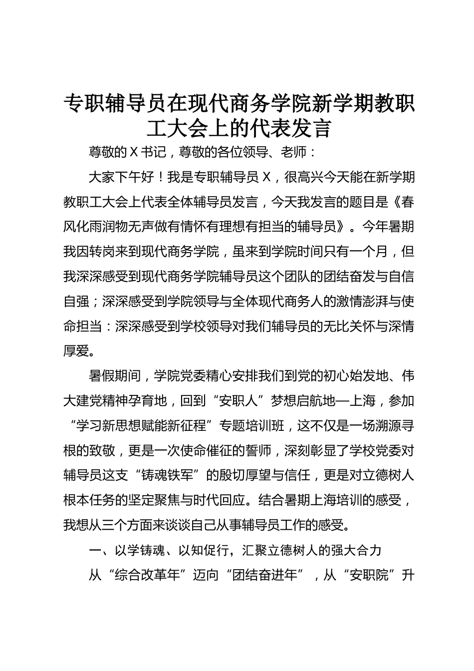專職輔導(dǎo)員在現(xiàn)代商務(wù)學(xué)院新學(xué)期教職工大會上的代表發(fā)言尊敬的X書記,尊敬的各位領(lǐng)導(dǎo)、老師:大家下午好!我是專職輔導(dǎo)員X,很高興今天能在新學(xué)期教職工大會上代表全體輔導(dǎo)員發(fā)言,今天我發(fā)言的題目是《春風(fēng)化雨潤物無聲做有情懷有理想有擔(dān)當(dāng)?shù)妮o導(dǎo)員》。今年暑期我因轉(zhuǎn)崗來到現(xiàn)代商務(wù)學(xué)院,雖來到學(xué)院時間只有一個月,但我深深感受到現(xiàn)代商務(wù)學(xué)院輔導(dǎo)員這個團隊的團結(jié)奮發(fā)與自信自強;深深感受到學(xué)院領(lǐng)導(dǎo)與全體現(xiàn)代商務(wù)人的激情澎湃與使命擔(dān)當(dāng):深深感受到學(xué)校領(lǐng)導(dǎo)對我們輔導(dǎo)員的無比關(guān)懷與深情厚愛。暑假期間,學(xué)院黨委精心安排我們到黨的初心始發(fā)地、偉大建黨精神孕育...