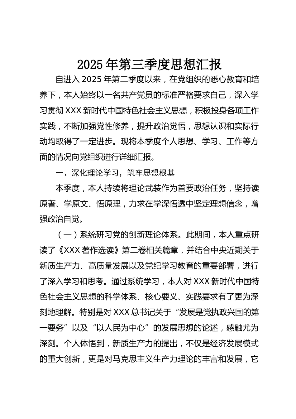 2025年第三季度思想匯報自進入2025年第二季度以來,在黨組織的悉心教育和培養(yǎng)下,本人始終以一名共產黨員的標準嚴格要求自己,深入學習貫徹XXX新時代中國特色社會主義思想,積極投身各項工作實踐,不斷加強黨性修養(yǎng),提升政治覺悟,思想認識和實際行動均取得了一定進步?,F將本季度個人思想、學習、工作等方面的情況向黨組織進行詳細匯報。一、深化理論學習,筑牢思想根基本季度,本人持續(xù)將理論武裝作為首要政治任務,堅持讀原著、學原文、悟原理,力求在學深悟透中堅定理想信念,增強政治自覺。(一)系統(tǒng)研習黨的創(chuàng)新理論體系。此期間,本人重點研讀了《XXX著作選讀》...