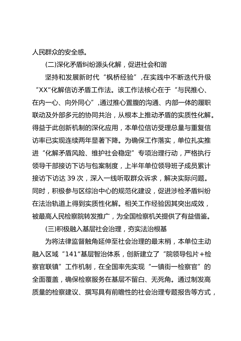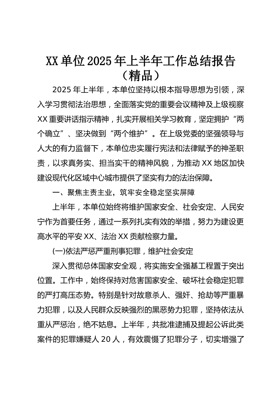 XX單位2025年上半年工作總結(jié)報告(精品)2025年上半年,本單位堅持以根本指導思想為引領(lǐng),深入學習貫徹法治思想,全面落實黨的重要會議精神及上級視察XX重要講話指示精神,扎實開展相關(guān)學習教育,堅定擁護“兩個確立”、堅決做到“兩個維護”。在上級黨委的堅強領(lǐng)導與人大的有力監(jiān)督下,本單位忠實履行憲法和法律賦予的神圣職責,以求真務(wù)實、擔當實干的精神風貌,為推動XX地區(qū)加快建設(shè)現(xiàn)代化區(qū)域中心城市提供了堅實有力的法治保障。一、聚焦主責主業(yè),筑牢安全穩(wěn)定堅實屏障上半年,本單位始終將維護國家安全、社會安定、人民安寧作為首要任務(wù),通過一系列扎實有效的舉措...