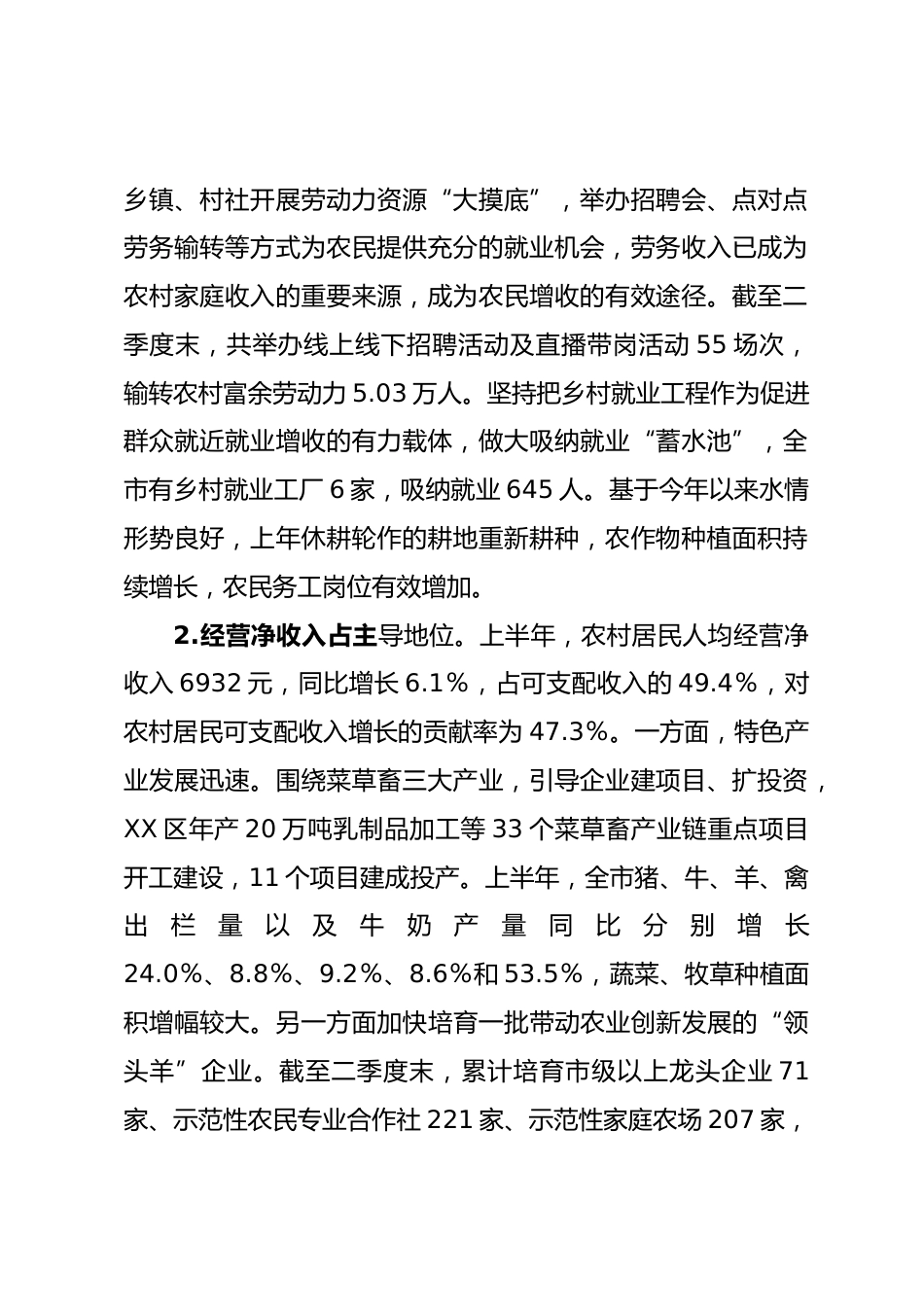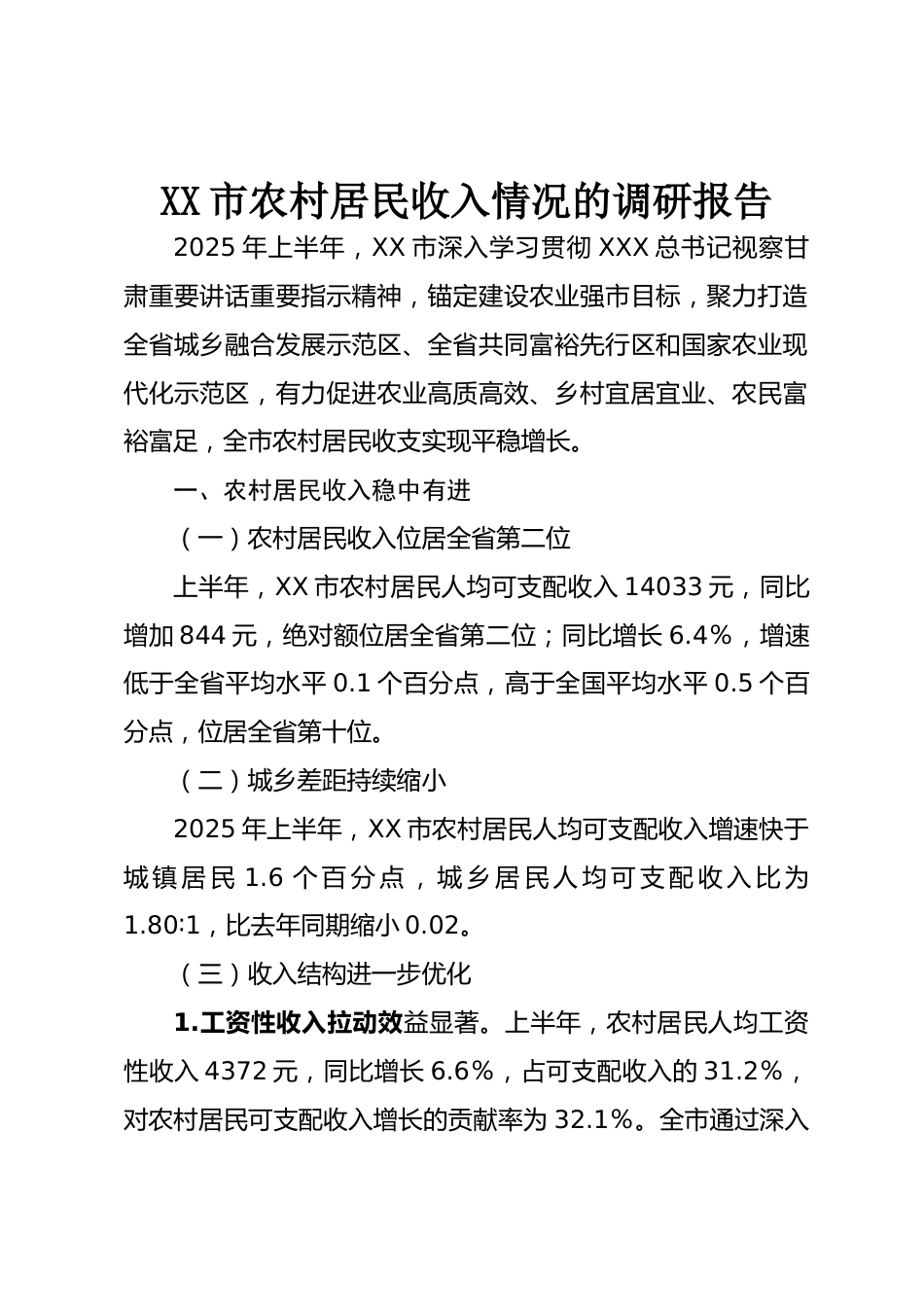 XX市農(nóng)村居民收入情況的調(diào)研報(bào)告2025年上半年,XX市深入學(xué)習(xí)貫徹XXX總書記視察甘肅重要講話重要指示精神,錨定建設(shè)農(nóng)業(yè)強(qiáng)市目標(biāo),聚力打造全省城鄉(xiāng)融合發(fā)展示范區(qū)、全省共同富裕先行區(qū)和國(guó)家農(nóng)業(yè)現(xiàn)代化示范區(qū),有力促進(jìn)農(nóng)業(yè)高質(zhì)高效、鄉(xiāng)村宜居宜業(yè)、農(nóng)民富裕富足,全市農(nóng)村居民收支實(shí)現(xiàn)平穩(wěn)增長(zhǎng)。一、農(nóng)村居民收入穩(wěn)中有進(jìn)(一)農(nóng)村居民收入位居全省第二位上半年,XX市農(nóng)村居民人均可支配收入14033元,同比增加844元,絕對(duì)額位居全省第二位;同比增長(zhǎng)6.4%,增速低于全省平均水平0.1個(gè)百分點(diǎn),高于全國(guó)平均水平0.5個(gè)百分點(diǎn),位居全省第十位。(二)城鄉(xiāng)差距持續(xù)縮小2025...
