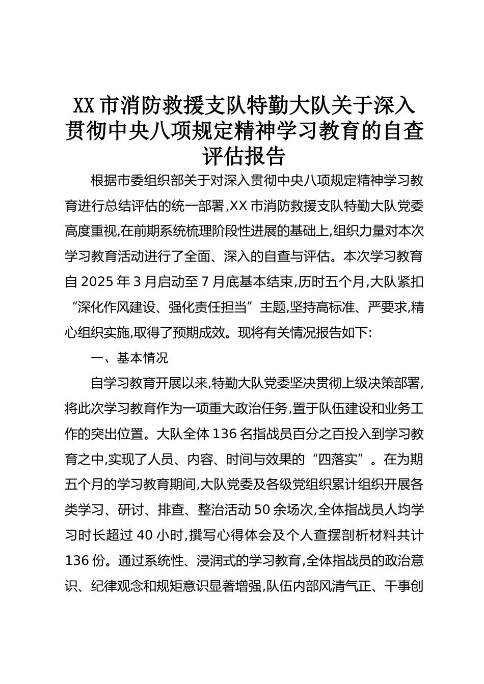 XX市消防救援支隊特勤大隊關(guān)于深入貫徹中央八項規(guī)定精神學習教育的自查評估報告根據(jù)市委組織部關(guān)于對深入貫徹中央八項規(guī)定精神學習教育進行總結(jié)評估的統(tǒng)一部署,XX市消防救援支隊特勤大隊黨委高度重視,在前期系統(tǒng)梳理階段性進展的基礎(chǔ)上,組織力量對本次學習教育活動進行了全面、深入的自查與評估。本次學習教育自2025年3月啟動至7月底基本結(jié)束,歷時五個月,大隊緊扣“深化作風建設、強化責任擔當”主題,堅持高標準、嚴要求,精心組織實施,取得了預期成效?,F(xiàn)將有關(guān)情況報告如下:一、基本情況自學習教育開展以來,特勤大隊黨委堅決貫徹上級決策部署,將此次學習教育作為一項重...