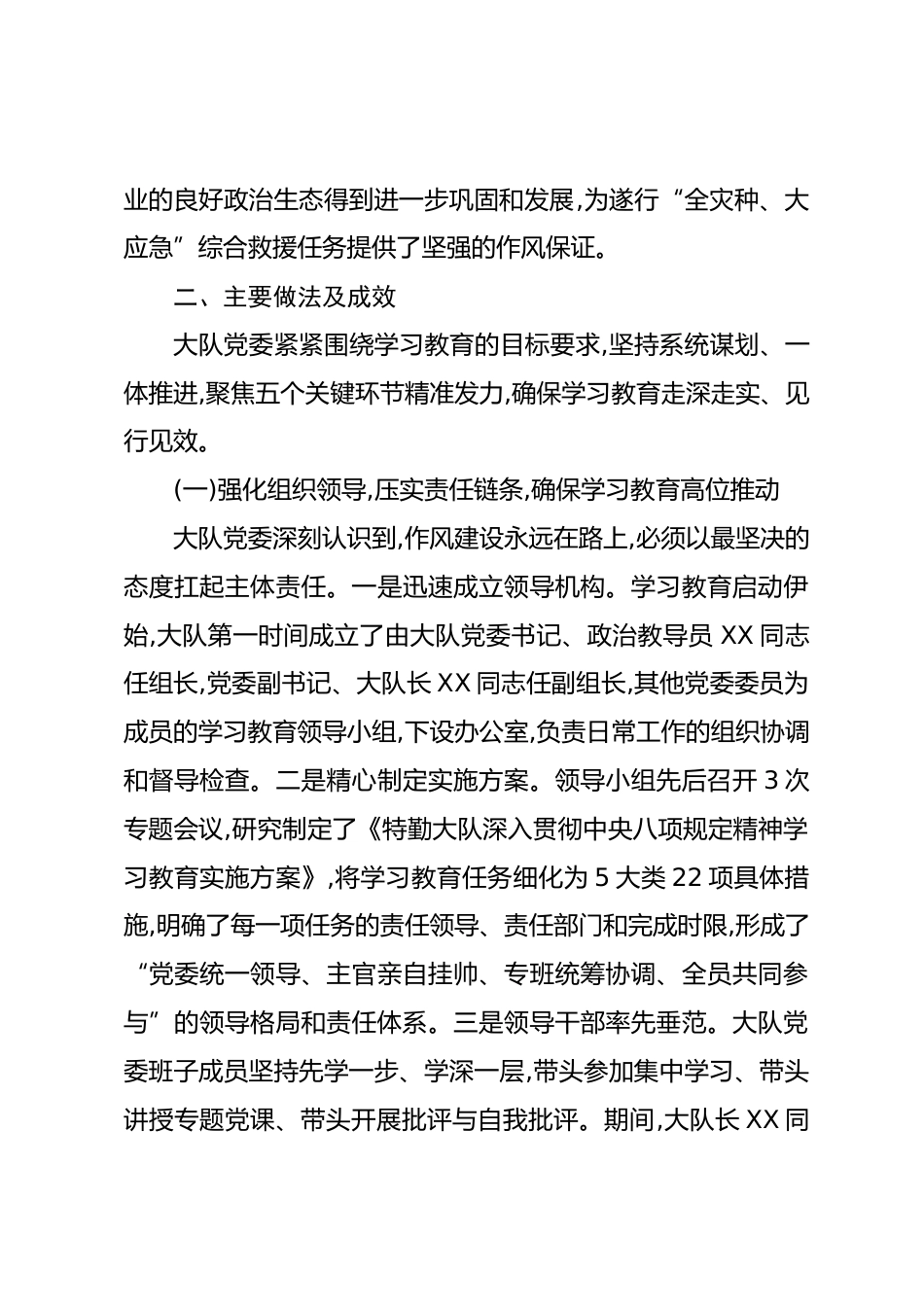XX市消防救援支隊特勤大隊關(guān)于深入貫徹中央八項規(guī)定精神學習教育的自查評估報告