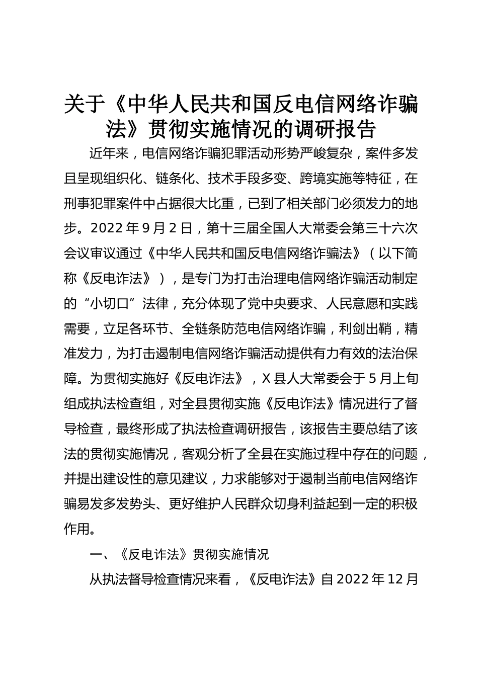 關(guān)于《中華人民共和國(guó)反電信網(wǎng)絡(luò)詐騙法》貫徹實(shí)施情況的調(diào)研報(bào)告