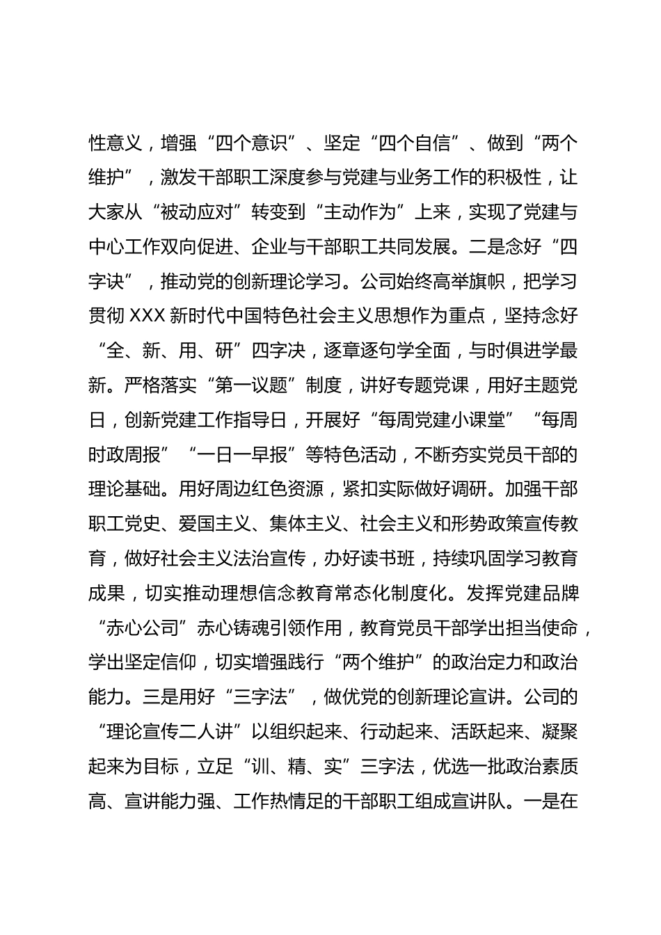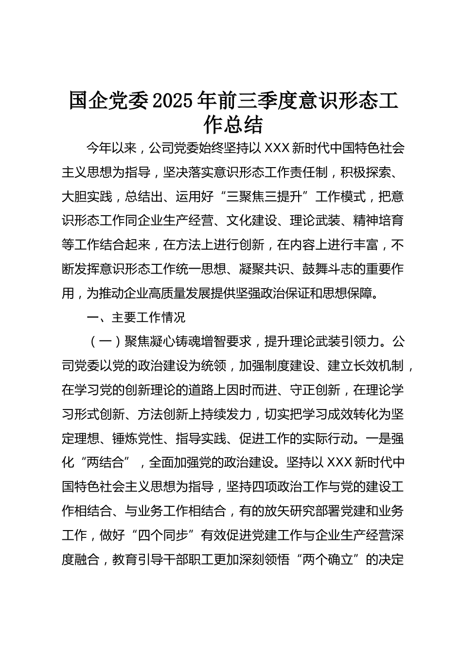 國企黨委2025年前三季度意識(shí)形態(tài)工作總結(jié)今年以來,公司黨委始終堅(jiān)持以XXX新時(shí)代中國特色社會(huì)主義思想為指導(dǎo),堅(jiān)決落實(shí)意識(shí)形態(tài)工作責(zé)任制,積極探索、大膽實(shí)踐,總結(jié)出、運(yùn)用好“三聚焦三提升”工作模式,把意識(shí)形態(tài)工作同企業(yè)生產(chǎn)經(jīng)營、文化建設(shè)、理論武裝、精神培育等工作結(jié)合起來,在方法上進(jìn)行創(chuàng)新,在內(nèi)容上進(jìn)行豐富,不斷發(fā)揮意識(shí)形態(tài)工作統(tǒng)一思想、凝聚共識(shí)、鼓舞斗志的重要作用,為推動(dòng)企業(yè)高質(zhì)量發(fā)展提供堅(jiān)強(qiáng)政治保證和思想保障。一、主要工作情況(一)聚焦凝心鑄魂增智要求,提升理論武裝引領(lǐng)力。公司黨委以黨的政治建設(shè)為統(tǒng)領(lǐng),加強(qiáng)制度建設(shè)、建立長效機(jī)制...