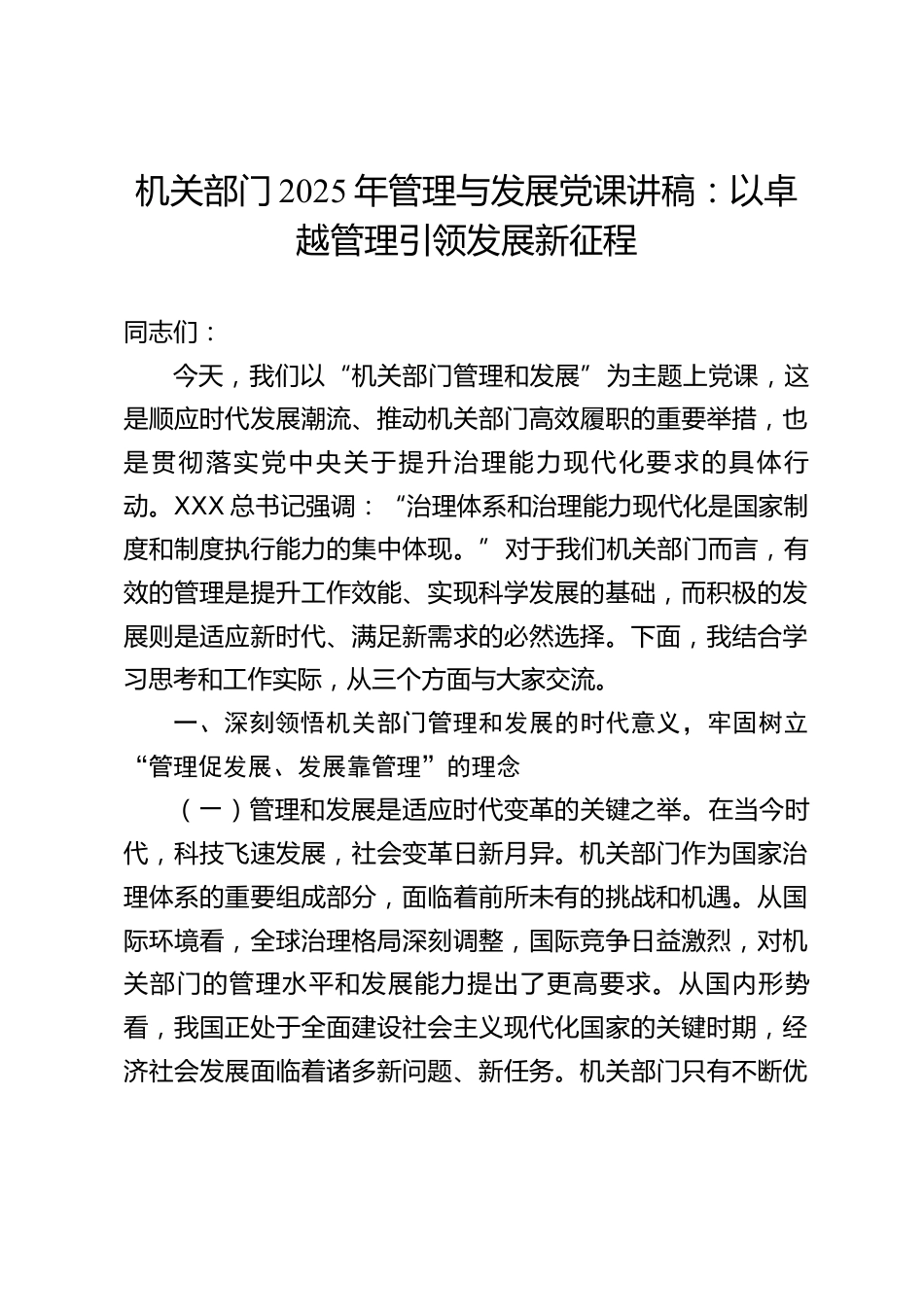 機(jī)關(guān)部門2025年管理與發(fā)展黨課講稿:以卓越管理引領(lǐng)發(fā)展新征程同志們:今天,我們以“機(jī)關(guān)部門管理和發(fā)展”為主題上黨課,這是順應(yīng)時(shí)代發(fā)展潮流、推動(dòng)機(jī)關(guān)部門高效履職的重要舉措,也是貫徹落實(shí)黨中央關(guān)于提升治理能力現(xiàn)代化要求的具體行動(dòng)。XXX總書記強(qiáng)調(diào):“治理體系和治理能力現(xiàn)代化是國家制度和制度執(zhí)行能力的集中體現(xiàn)。”對于我們機(jī)關(guān)部門而言,有效的管理是提升工作效能、實(shí)現(xiàn)科學(xué)發(fā)展的基礎(chǔ),而積極的發(fā)展則是適應(yīng)新時(shí)代、滿足新需求的必然選擇。下面,我結(jié)合學(xué)習(xí)思考和工作實(shí)際,從三個(gè)方面與大家交流。一、深刻領(lǐng)悟機(jī)關(guān)部門管理和發(fā)展的時(shí)代意義,牢固樹立“管...